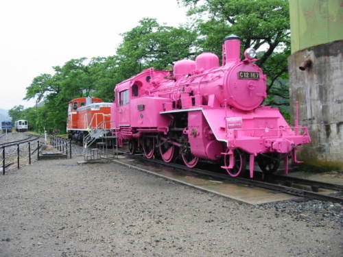 昨日はシニアの遠足、4台のバスで、若桜駅へむかいました。 雨、雨、百名弱なんなんとする参加者の大遠足にしては、いささか気の毒な天気でした。 恋山形のピンクが、桜の開花にあわせ若桜の機関車にも伝播した如くで装われていました。 あざやかなピンクに変身ぶり。 ゴールデンウィークに訪れたお客は、住民数より多い4000近くあったそうです 昨日、ゴールデンウィーク終了でイベント終了。 みなさん、ホットして、一息。そこに大挙して訪問。 構内ごったがえし。 ここまでだ。鼻先をかわして方向転換。重たい機関車を乗せてくるりとまわした転車台が、歴史を物語っていました。昭和5年開通。俺と同じ歳だはM爺。 ウィーク終了でホットしてるところに、百近くの人間が訪問したので、大変でしたでしょう。 社長さんが、小雨にぬれてメガホンもって、現地説明です。ありがとうございました 若桜は、林業のまち、若桜杉は、ブランドとして有名、全国に知られてきました。 鉄道もそれにつれ伸びてきました。 でも木材世界事情がかわり、流通の変遷により、辛苦する状況が訪れ、人口も流出、斜陽と化しました。 社長さんは、場所を変えお隣の広間をかり、そこで若桜鉄道の奮戦記を語ってくれました。 若桜線も、例にもれず採算割れで、国鉄から切り離され、廃線の危機を第3セクターで存続にかけました。 その生き残りの策を、地域おこしとパックにして、20人たらずの社員で模索し努力奮闘まっしぐら中でした。 みじんも、悲壮感はなく、次にどんなアイデアが生まれるのかという期待感までわきました。 さすが「即戦力になれること」の公募条件をクリアした、応募社長さんでした。 「このお話しをきいただけで、大満足だ今日の遠足は!」とW爺の独り言。みんなに聞こえた。 お隣の無人駅は、これまた、名前が「隼」であるため、全国のオートバイ隼の仲間が終結する有名スポットができました。今年も沿線全駅参加で、歓迎イベントしたそうです。 ピンクの機関車は、イベントの夢をむさぼるのを止める如く、私たちの見学が最後で、明日、社員で黒に塗り替えられるそうです。ing,ing.次に進すもう。 ちょうど同じく倉吉線も赤字路線で存廃の選択の岐路にたち、廃線を選びました。 頭真っ白のL爺、「倉吉線の廃線は、人心まで廃線したままだぞ、倉吉・関金繋がねばならん。」シニアの快挙図らねばならんと帰路の車中で息まくことしきり。 ここには、ここの生かし方があるはずです。 戦中経験の者ども、気分だけは、まだまだ若い魂もってるようです。 今日の遠足、これまで。