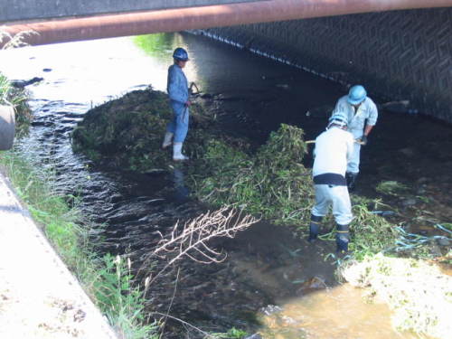 3尺下がれば清くなる。 昔の川は、そういったもの。 今は、浄化力能力を超えて酷使してるようだ。 わが班は、2級河川がながれている。 その土手の道路が通行止めになった。 橋の下にゴミの山ができて機械で搬出せねばならないほどの事態発生。 田植え前の水路掃除で、流れてきたゴミらしい。 作業員がフォークをさしてもなかなかとれない。 よくみるとクレソンの塊で根がついていて異常に太い茎が成長し絡み合っている。 橋の下は、日陰で成長の条件が充ちたようだ。 クレーンで引き上げる大がかりになった。 審議員さんと館長さんが、市役所にかけあって掃除になったよう。 大型車が止まったら、交通ストップのものものしさ。 大水が最近あったこともないし、上流へいってみた。 ある。ある。 途中にひっかかったものは、適当に枯れ、新しい茎をだしてるのもある。 2キロほど上がると、もう川面はみえぬほどのクレソンや藪の繁茂。 この上で川掃除したものが、ひっかかり、ひっかかりで下まで流れてきたのだろう。 一汗、二汗かいて、帰ってきたら、綺麗に川は掃除されてありました。 クレソンはきれいな水に育つといいます。食堂で小さな香りがみなぎる時はいいが、こんなクレソンはうんざり。大水があれば、日本海にみな流れる。なんとかせねばならない。 22日は総事、せめて、町内分だけでもきれいにせねば。 3尺さがっても川はきれいになりません。