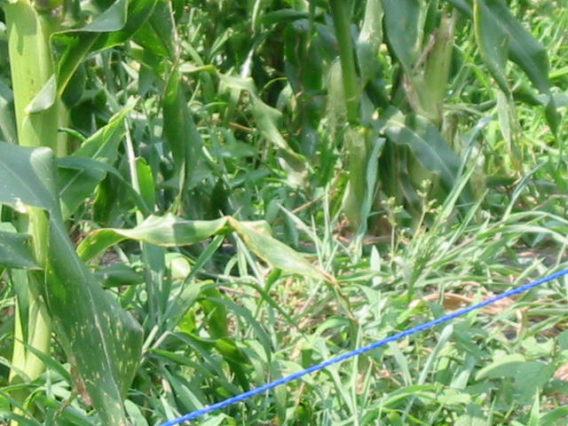 スイートコーンの味をしったら、もう大変、大急ぎでコーンの周りに青い電線で柵を張るしまつ。