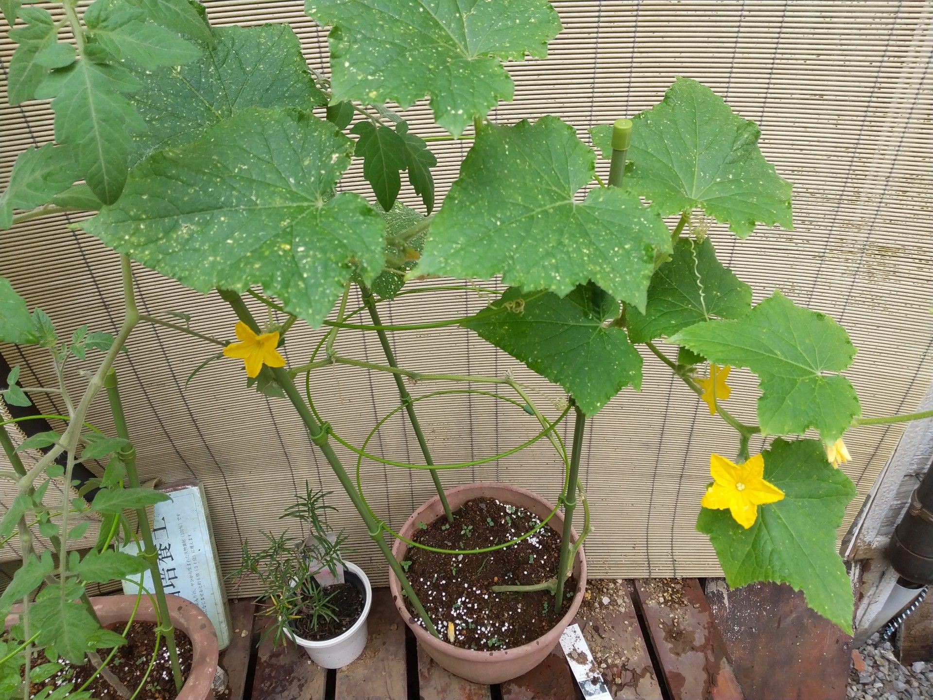 今朝、自宅の庭を見たら、 こんな感じにきゅうりが育ってました。