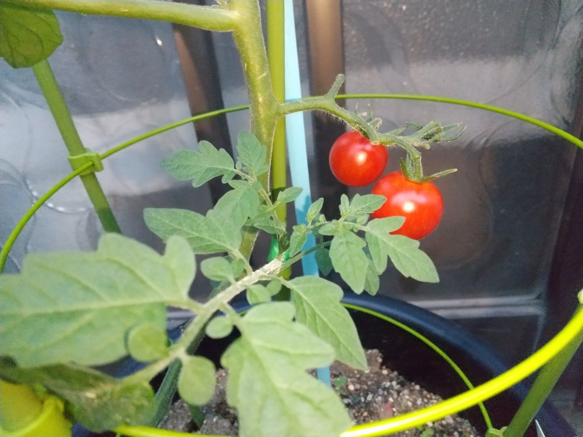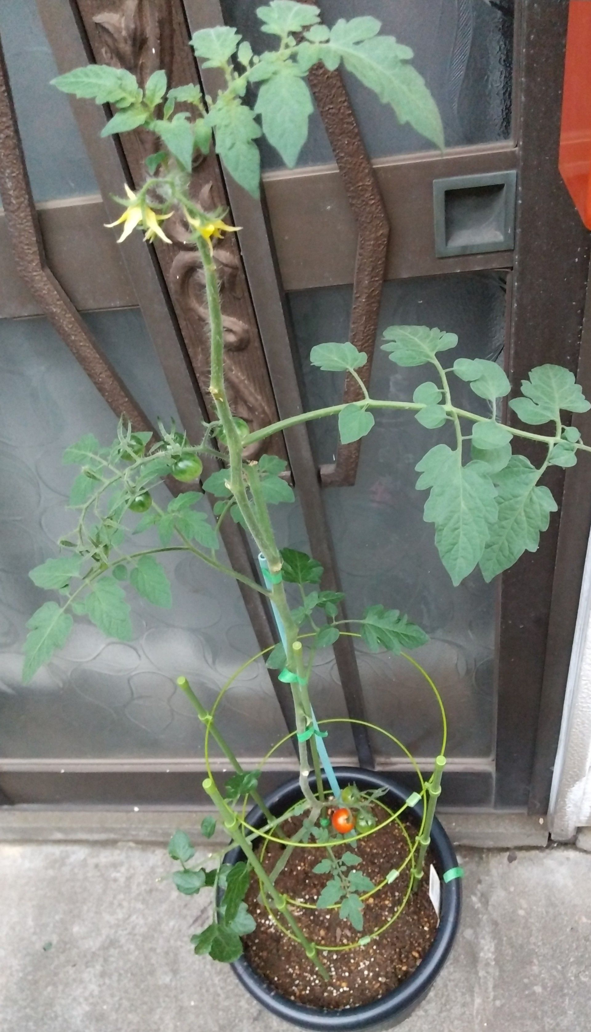 今日、昨日は続けて仕事に行った。 くたくたに疲れたので、帰り道にすぐ食べられる物を買いに行った。 ミニトマトをこわごわと食べて見たら、ちょっと酸っぱさがあった。まだ採るにはやはり早かったのかなぁ。 ミニトマト、因みにまた上に花がついてた。上に伸びすぎてしまった。