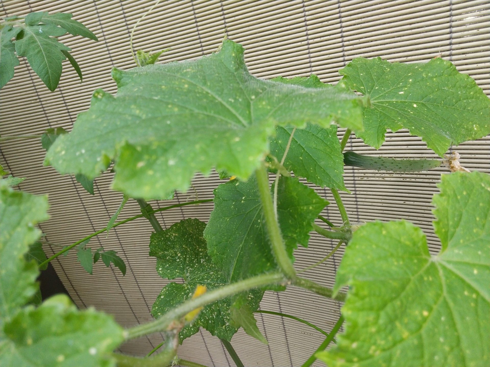 やはりきゅうりが育たない。 最近、日照不足、雨ばかりで太陽が出ないから全然大きくならないのです。 これで終わりかぁ? 写真の右側に、ほそ~く写っています。