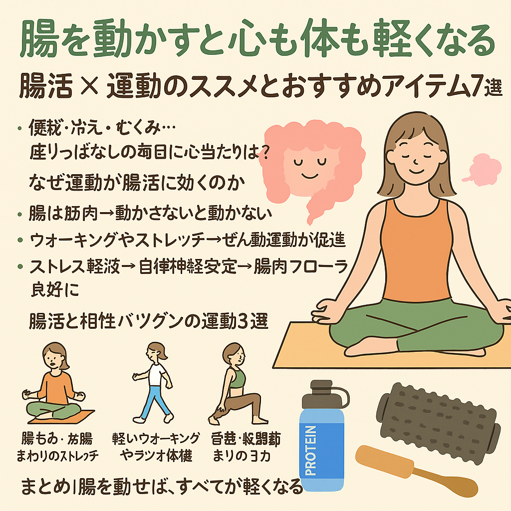 こんにちは、てらチャンス!です😊「腸にいいものは食べてるのに、なんだかスッキリしない…」そんな風に感じていませんか?実はそれ、“動く”ことが足りていないのかもしれません!今回は、腸が整う「運動習慣」と相性バツグンの腸活アイテムをご紹介します✨ 💡 運動不足が腸にも与える影響長時間の座りっぱなし → 腸のぜん動運動が低下血行不良 → 代謝・排出力DOWN自律神経の乱れ → 便秘・下痢・メンタルの乱れにも…腸は「動かすと動く臓器」。じっとしていると、便も気分も滞りがち💦🔄 腸活と相性バツグンの“軽い運動”3選🧘♀️ 1. 腸もみ&お腹ストレッチ→ 腹部の筋肉をゆるめて、便通UP+血流促進🚶♀️ 2. ウォーキング(20分程度)→ リズム運動は腸のぜん動をサポート!朝がおすすめ🧎♀️ 3. 骨盤〜股関節まわりのヨガ→ 下半身の循環改善で“冷え便秘”タイプに効果◎🛍 腸を動かす!運動×腸活おすすめアイテム7選① 着圧レギンス&腹巻き(腸活専用)お腹まわりを温め&サポート!冷え性さんの便秘改善に好評【P5倍★SALE期間限定】【日本製】シルク 腹巻パンツ ロング 10分丈 シルク100%糸 生理痛緩和 腹巻きパンツ はらまきパンツ 腹パン 腹巻 腹巻き パンツ 温活 妊活 腸活 レディース レギンス スパッツ インナー 十分丈 妊婦 マタニティ 薄手 伸縮性 速乾 冷え取り 冷え対策】[ マラソン中10倍 ] 腹巻きパンツ / 日本製 薄い 吸湿 速乾 薄手 蒸れにくい 春 夏 インナー ボトム 子供 毛糸のパンツ パンツ レギンス タイツ 生理 うすい はらまき レディース かわいい おしゃれ 敏感 肌 やさしい 女性 妊婦 妊活 腹帯 パジャマ 温活 妊活 腸活② 腸もみローラー or フォームボール寝たまま使えて腹部ストレッチにも◎ 血流と排出力UPチョモミ★特典付き★腸もみ エステ【専門家監修】chomomi 器具 グッズ マッサージ ガジェット 伊藤超短波 腸もみトリートメント メーカー保証1年[サロンの施術をご自宅で]③ 乳酸菌プロテイン(酵素入り)運動後のたんぱく補給+腸ケアが同時にできる優秀アイテム【200円OFFクーポン!セット限定】2個セット マミーズプロテインLITE 300g ココア味 ホエイプロテイン プロテイン 乳酸菌 オーガニック ダイエット 美容 授乳中 妊活 高たんぱく タンパク質 補給 腸活 腸内環境 間食 栄養 置き換え【送料無料】【DM】【ST】【海外×】④ ヨーグルトタブレット(乳酸菌タイプ)おやつ感覚で菌活!動いた後のリフレッシュにも【本州送料無料】Systema 歯科用オーラルヘルスタブレット 90粒×3個システマ クリーンミント味乳酸菌タブレット北海道・四国・九州行きは追加送料220円かかります。ライオン歯科材⑤ ミニステッパー or ゆらゆらボード在宅の隙間時間に有酸素運動→腸がぽかぽか動き出す♪ATEX アテックス ルルド ゆらゆら健康器 AX-FY919or オレンジ 足をのせるだけで簡単ゆらゆら運動器⑥ 甘酒×食物繊維のドリンクセット運動後の“腸ごほうび”。スッキリ+肌も喜ぶ1杯【有機玄米甘酒】 Bioene 720ml ビオーネ 甘酒 米麹 あまざけ ノンアルコール レジスタントプロテイン KOJI DRINK 国産 有機玄米 有機JAS認証 玄米甘酒 当店オリジナル MURO あま酒 砂糖不使用 ノンシュガー 飲む点滴 おしゃれ 香ばしい 食物繊維⑦ 腸内フローラ検査キット運動&食習慣でどう変化したか?目に見えるとモチベUP!【特別セーーーール!!!】【メーカー公式】ダイエット遺伝子検査キット「遺伝子博士」+腸内フローラ検査キット「腸内博士」セット🧠 まとめ|動かすことで、腸はもっと応えてくれる腸内環境は「食べるだけ」では不十分軽い運動 × 発酵食品/菌活サポートで“感じる腸活”に体をちょっと動かすだけで、気分・お腹・代謝が変わってくる!💬 最後にひとこと運動が苦手でも大丈夫。5分でも、10分でも、「お腹を意識して動かす」だけで腸が少しずつ目覚めていきます✨てらチャンス!は「がんばりすぎない健康習慣」を応援中!また次の記事でお会いしましょう🌿