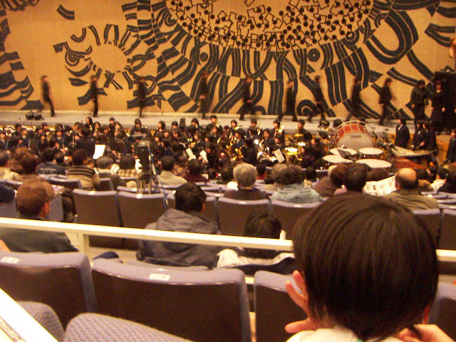 客席最前列には市内の中学校、高校の吹奏楽部、市内の混声合唱団などによるオーケストラボックスが設定されていて音楽は生演奏。