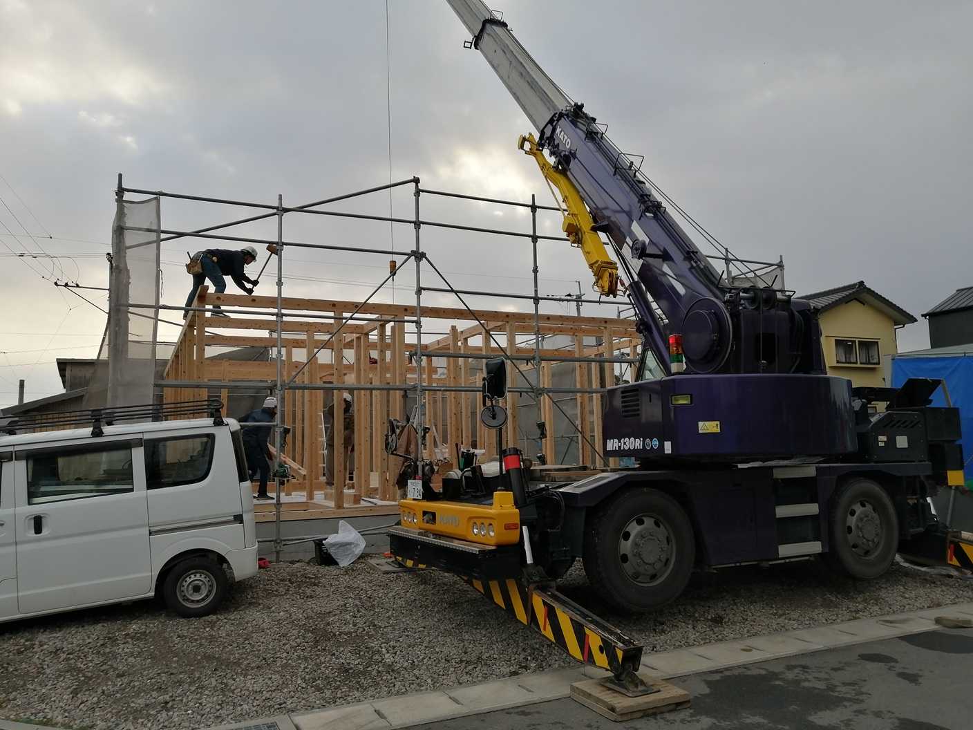 上棟式ともいいますね。昨日26日に上棟しました (^_^)v上の画像は午前8時30分くらい(作業開始は8時)。下の画像は午後4時くらい。熊本は今冬一番の冷え込みでした。大工さんたち、寒い中御苦労さまでした。