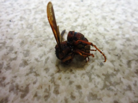 最近8が・・・8 → 蜂の事ですが・・・野中にいるんです。一昨日の事です。事務所で夕方仕事をY君としていて、事務所がかなり暑くなっていたので、エアコンのスイッチを入れた時・・・エアコンの中から黒い物体が、ものすごい勢いで出てきました。最初は、ゴキブリ??と思ったのですが・・・違いました。蜂でした!!!かなり、大きな蜂で正直腰が引けていました。以前、子供の頃に私蜂に刺されていた事もありあんな大きい蜂に遭遇するのは、初めてでビビリまくりでした。2人で協力し、倉庫にレクで使用した虫取り網があったのを思い出し2人で、殺虫剤と網を持ちいざ駆除へ!!!均衡を保ちながら、作戦を練り一人が殺虫剤を持ち、もう一人が飛んだところを捕獲し駆除!!作戦はバッチリです!!の・・・はずいざ、ミッション開始!!!飛び上がった蜂を網で私が捕まえようと、振りかぶりましたが不発!!!!!緊急事態です!!!!慌てる2人・・・そして、敵意をむき出しにした蜂は、私たちに向かって、飛び出しました!!!そこで、2振り目!!!見事に捕獲成功!!!!かなり、危険な状態でした。その後は、殺虫剤をこれでもかというくらい吹きつけ駆除終了!かなり、体力を消耗しました・・精神的にも・・・で、その蜂がこちら↓まぁ~~~エグイ写真です現在巣が近くにあるかもしれないので、調査中です。利用者さん・他スタッフが刺されでもしたら一大事です!!!これだけ、気温が上がると蜂さんも行動が活発になるんでしょうねぇ。早く見つけて、駆除したいと思います。では、ざぁーまビビリまくりのざぁーまでした。
