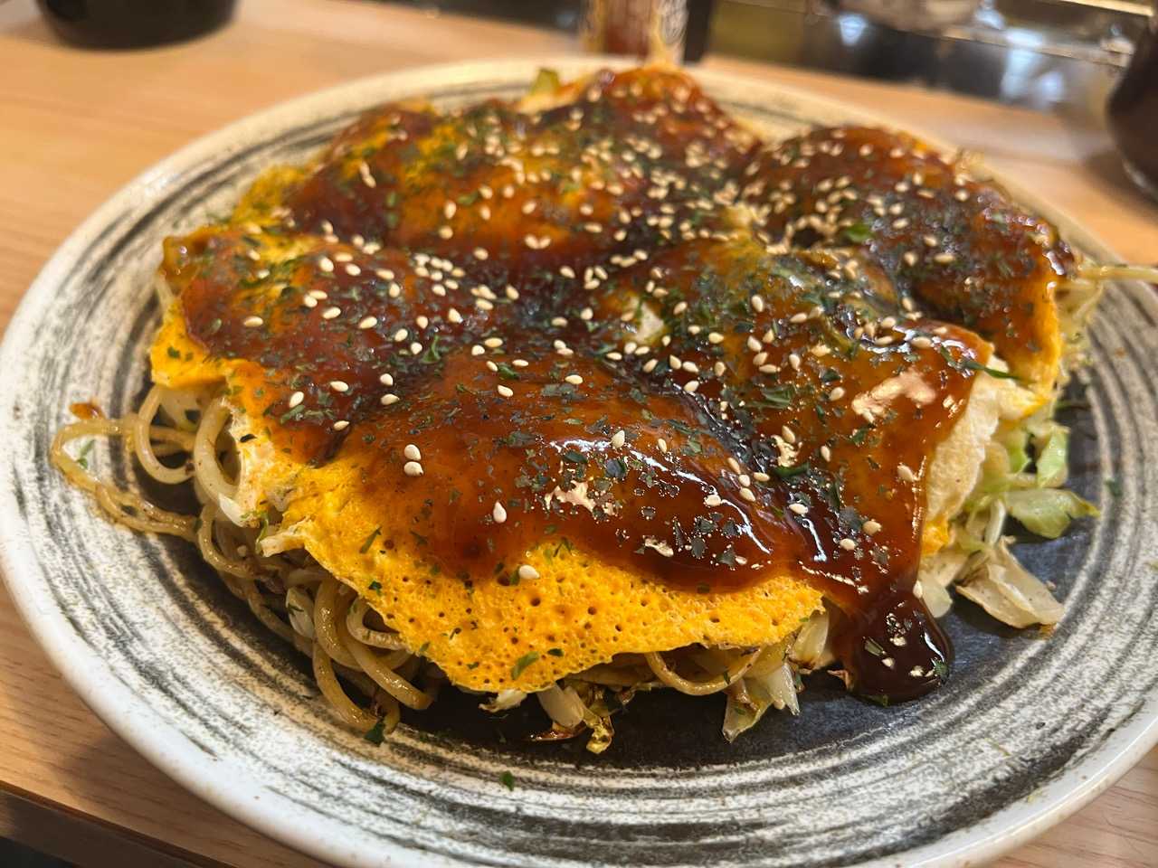 今日のお昼ごはん。うどん入りの関西風お好み焼き⭐️