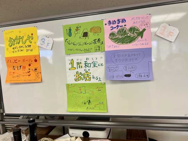 夏祭りの1階の店。ビー玉ゲーム、まめまめコーナー、サウンドクイズ…