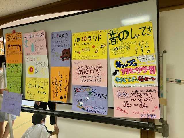 夏祭りの2階。クラフトルーム、見たい作品投票、♪たたき、ペットボ…