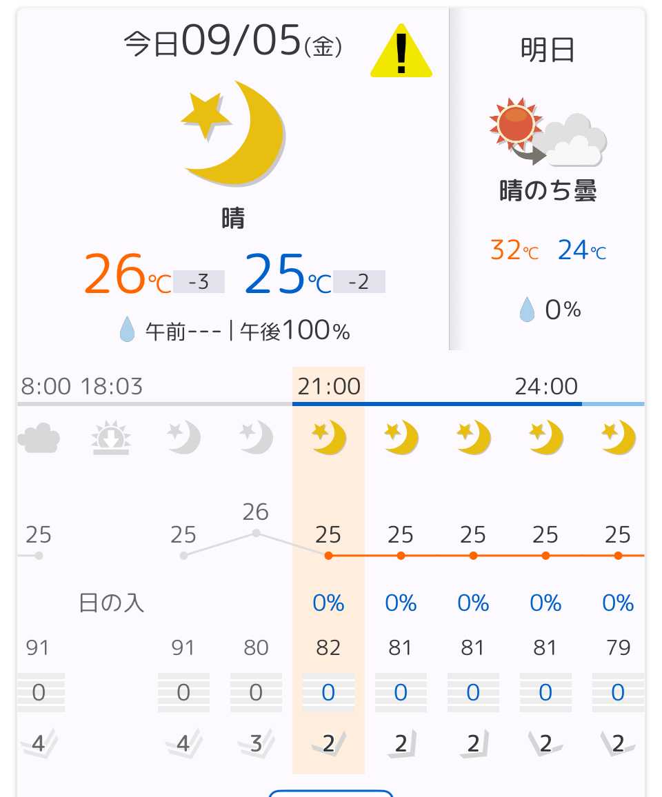 久しぶりにエアコンなしで寝られるよ。でもまだ25℃。暑さに慣れたん…