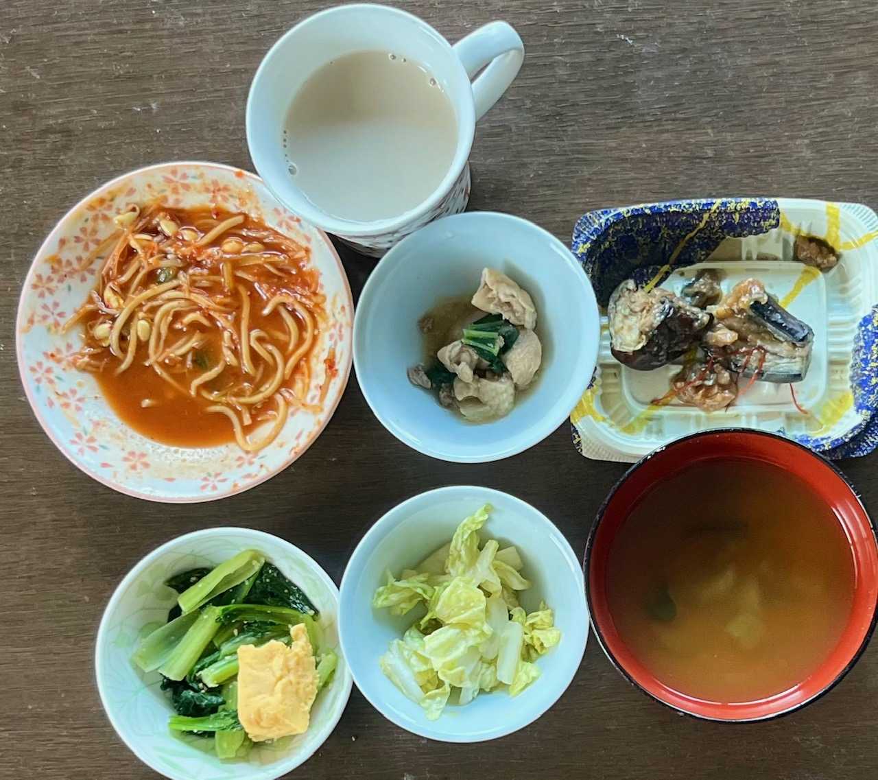 朝食は、鶏・大根・白菜・青梗菜の葉の煮物、茄子の肉味噌餡かけ、白…
