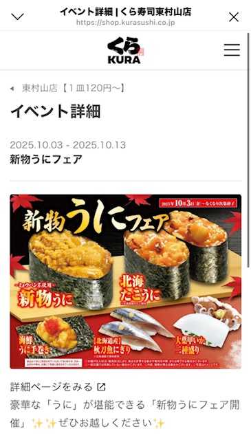 くら寿司の新物うにフェア。10月3日から、品切れまでとなってたけ…