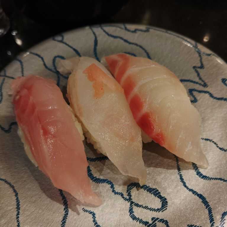 白身三種(真鯛・平目・すずき)(550円)〈たぶん、廻る富山湾 すし…