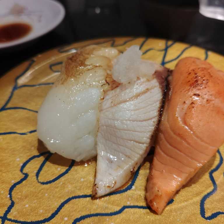 あぶ三種(ぶり・えんがわ・サーモン)(660円)〈たぶん、廻る富山湾 すし玉 富山駅店〉