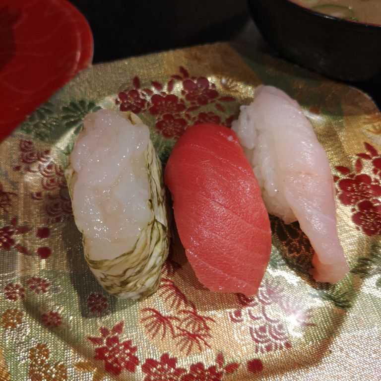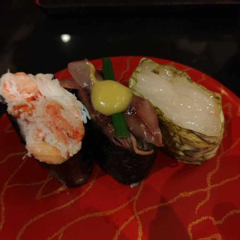 白身三種(真鯛・平目・すずき)(550円)〈たぶん、廻る富山湾 すし玉 富山駅店〉