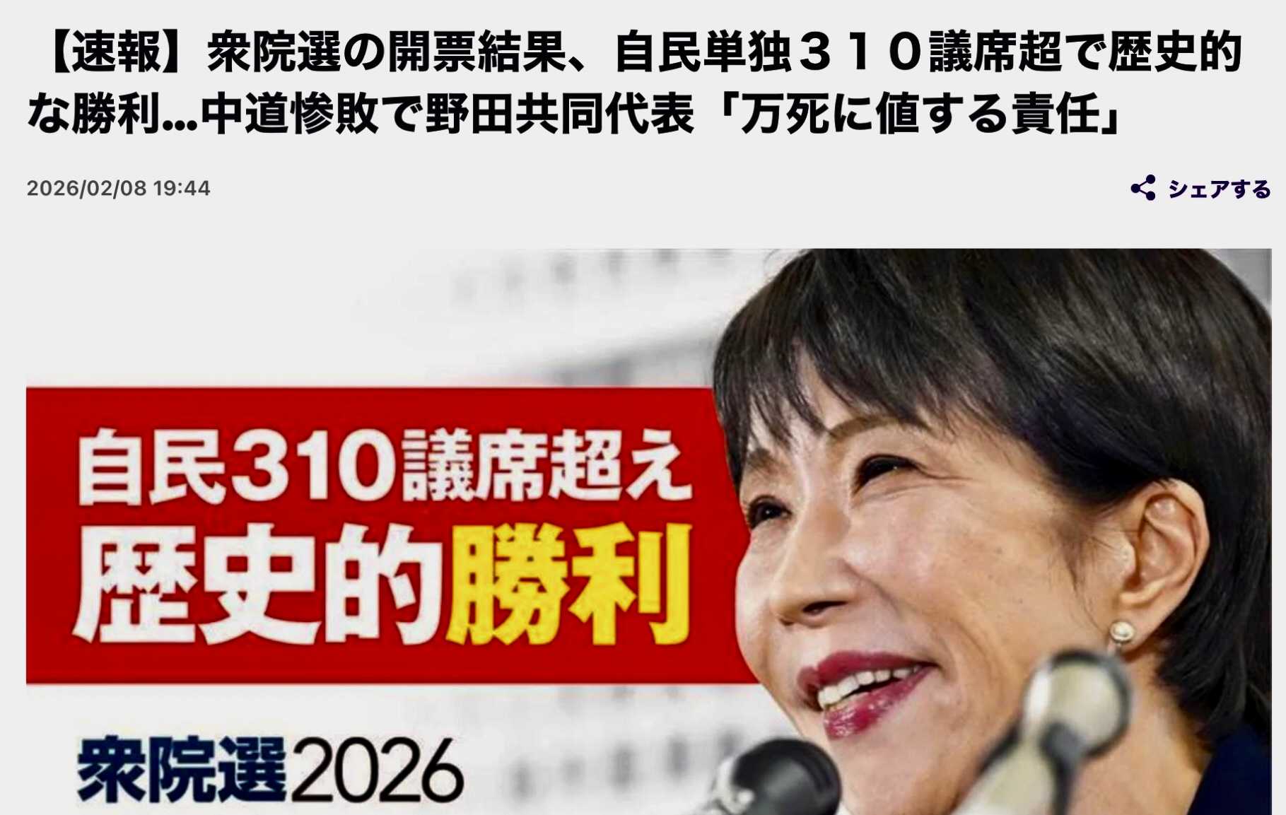 【日本終了】衆院選、自民党過去最高316議席(3分の2以上)獲得…高市氏…
