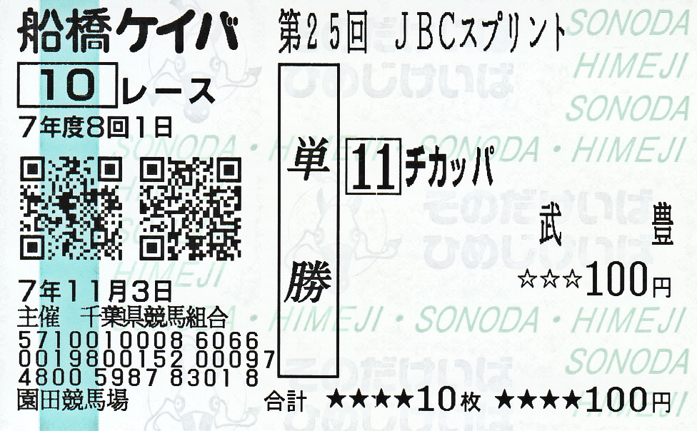 【記念単勝馬券】 JBC船橋/門別(2025年)