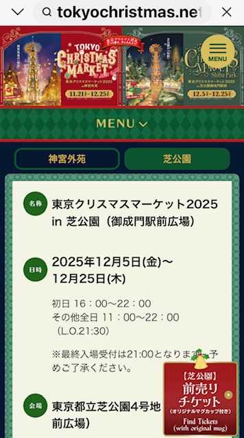 Yさんから、クリスマスマーケットのお誘い。神宮外苑と、芝公園の両…