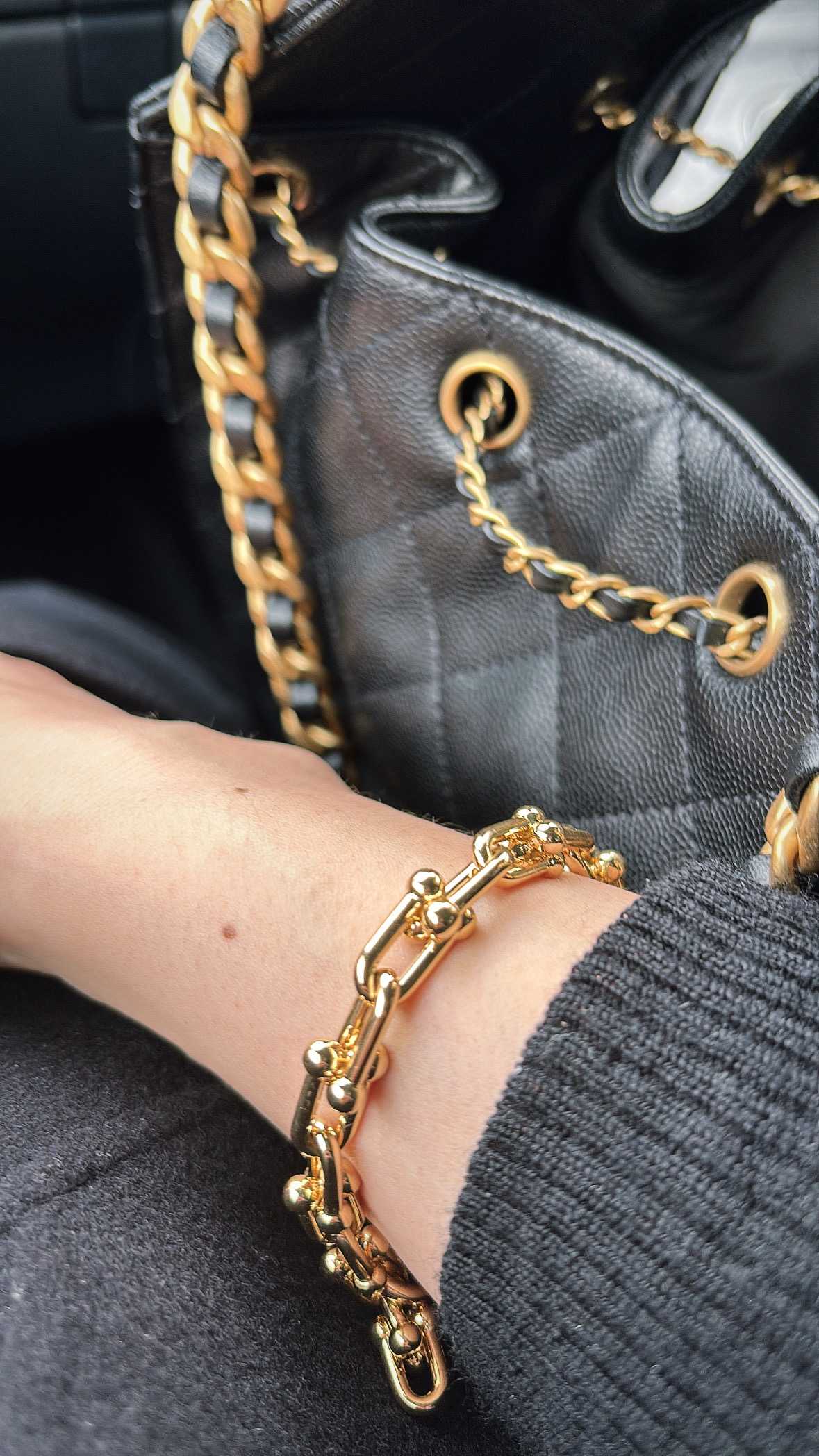 コートの袖口からきらりと覗く シャイン ゴールド ノット バングル