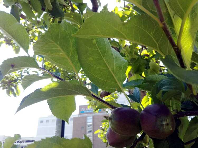 ヨーカドーの近くのりんごの木が、実をつけていました