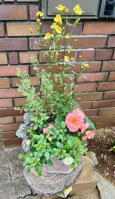 ご近所の花。 球根ベゴニアが素敵な寄せ植え。ミニバラ? 鉢もクラ…