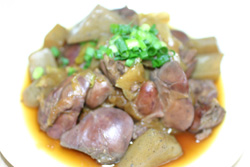 子供の頃によく食べていた「鶏レバーの煮込み」がどうしても食べたくなって初めて作ってみました。でも、いまいち作り方が分からなかったので早速実家に電話して母に作り方を教えてもらいました。作り方を聞いて調味料の分量を聞いたら「そんなの分かんないわよ~~自分流でやってんだから。自分で良い様に味付けしなさいよ」と言われてしまいました。さすが私の母です。なんせ、私も全て目分量ですから。で、作ってみました。鶏のハツと冷蔵庫にあった、こんにゃくとねぎも加えて。かなり、美味くできました。今回は自画自賛です。鶏レバーも全く臭みもなく食べると、とろけてなくなります。ハツもコリコリしててうまうまです。はぁ~~やっぱり私はお父さんとお母さんの子供だな~~って改めて思いました。同じ味、同じ食感でした。それと、もう1品。これまた簡単。きのこを切ってフライパンに入れて火をつけて、上からごま油をかけ、塩、胡椒で味付けをしたら上からクッキングホイルを被せてしばらく置いていれば出来上がりです。クッキングホイルをかけて置いておけば出来るので、この間にもう1品作ったり、洗い物をしたり出来ますよ。これに大根のお味噌汁をつければ、今夜の晩ご飯の出来上がりです。大根をつい1本買いしちゃったからせっせっと食べなくちゃ~~