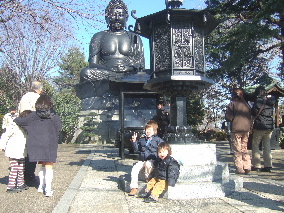 今日は母と甥が帰る日。甥はあしたから学校が始まるので。新幹線の時間は午後からなので、近場でどこか行くとこないかなあ、なんて考えてて思い出したのが、大仏様。私が暮らす区内に東京大仏と呼ばれている大仏様をまつるお寺があったのを思い出してさっそく行ってきました。長男が生まれる前に一度だけ行ったことがあるけれど、そのときは紅葉がきれいだったけれど、閑散としていて、お店も開いてなかった記憶が・・・でも、今日はまだお正月期間中だからか、初詣にきている人がいたり、観光バスも止まってるし、お店も開いてて、おみくじやお守りなども売ってました。その後は、少し公園で遊んでランチして東京駅まで母と甥を送って行ってきました。そろそろ、到着してるかな。あっという間におわった冬休み。あさってからは幼稚園。だらけ気分をふりはらわなきゃ。English Here