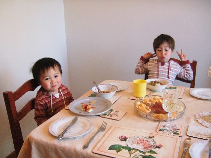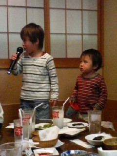 ダダが出張中。豪華なホテルに豪華な食事、仕事とはいえ、プーケットでリゾートしてると思うと、家事は手抜きしたい気分の私。幼稚園ママのお誘いで、夕飯を食べにでかけました。夜、いつもよりは遅くなる可能性が高いので、子供達は、しっかりお昼寝し。いざ、出発。長男は、去年夏に、私の実家に行ったときにカラオケに行って、とても楽しかったらしく、たま~~に思い出しては、カラオケ行きた~いと懇願してました。ママ達4人に、子供8人。普通のファミレスは厳しいので、個室のある居酒屋へ。そこはカラオケも完備されてて。大人は、アルコールも楽しみつつ、子供達は歌いまくり、楽しいひとときを過ごしてきました。長男が歌ったのは、ゲキレンジャー、マジレンジャー、仮面ライダーカブト、デカレンジャーボーケンジャー、ガオレンジャー、おかあさんといっしょの歌多数。ガオレンジャーは、次男が好きなので選んだんですけど、ガオレンジャーの映像もでてきて、次男は釘付け。ガオレンジャーの歌が終わると、私のそばに戻ってきて目を輝かせて、「ガオ、たしゃ、ガオ、タシャ、!”#$%&%$#”!」と、興奮しながら報告してました。歌って、踊って、楽しかったなあ。今度はダダも一緒に行こうね