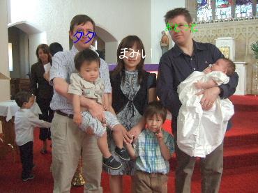 今日は、1月に生まれたダダの弟の娘の洗礼でした。ダダの家族はカトリックで、みんな洗礼を受けています。私は無宗教ですが、高校がカトリックの学校だったので、多少の知識はあるし、カトリックのダダと結婚するときには教会で夫婦になるためのお勉強会にも参加したので、特に悪いイメージはありません。なので、我が家の子供達も生まれてすぐに洗礼を受けることになったときも、特に反対する理由もないので、受けています。洗礼って、とてもおめでたいことで、家族、友達、たくさんの人が集まってお祝いします。まずは、教会で洗礼を受けます。その後は、パーティ。こんな大きなケーキやこんなかわいいケーキが準備されていました。パーティにはもちろん、ダダの両親、妹家族、妹も来ていて、我が家とも久しぶりの再会でした。長男はいとこたちに会えてハイテンション。他にもきていた子供達とも1年ぶりの再会でしたがすぐにうちとけ、楽しそうに遊んでました。今回のパーティで初めて気づいたんですけど、洗礼の時ってこんなに盛大にお祝いするんだなあって。洗礼を受けた子から見れば、パパ、ママのお友達、おじいちゃん、おばあちゃんのお友達、もちろん家族(おじさん、おばさん、いとこたち)も集まって総勢40人近く来てたんじゃないかなあ。私は洗礼に関しては素人だし、ダダはそういうこと無頓着な人なので、自分の子供達のときは・・・まっいいか。ちなみに、今日の主役生後2ヶ月になりました。English Here