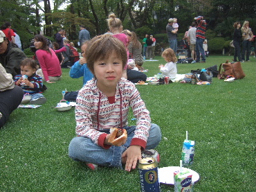 昨日は、イースターサンデーといいまして、詳しくはよくわからないけれど、キリストが復活した日?で、復活をお祝いする日らしいです。オーストラリア協会主催のイベントが、オーストラリア大使館であったので、行ってきました。「チルドレンズ イースター パーティ」です。子供達がたくさん来ていて、フットボールを教えてもらったり、オージーバーベキューをいただいたり、いろいろ。エッグハントと言って、卵の形をしたチョコレートを子供達は、捜してまわります。キリスト教の国の子供達は家庭でも同じようなことしてるはず。長男がみつけたチョコレート。ほんとは12個みつけたけど、ひとり5個までねといわれて回収されちゃいました。大使館の広い敷地で走り回ったり、公園のようなところで遊んだりと、はしゃいでいた長男。子供達がたくさんいたけれど、慣れるまではシャイなのでなかなか交わることはできず、ひとりで走りまわっていました。英語を話す子供達を見ると圧倒されちゃうみたいで・・・今回はもうひとつ、出会いがありました。このブログを見てコメント残してくれた人で、我が家と同じ、オージーのご主人に、男の子2人のママ。それも、5歳と3歳なので、我が家と似ていて。都内在住と聞いたので、ぜひお友達になりたいと誘ったら、快く、このパーティに来てくれて、会うことができました。5歳と3歳の男の子。かっこいいかったです。かわいいというより、かっこいいって感じ。日本語と英語を普通に使い分けてるし。それでいて、ヒーローものも大好きで。ママもご主人も話やすそうな方で、人見知りの私ですが、お話しできて楽しい時間が過ごせました。帰る頃には、長男も少しお話できるようになってたし。また、会えるといいな。English Here