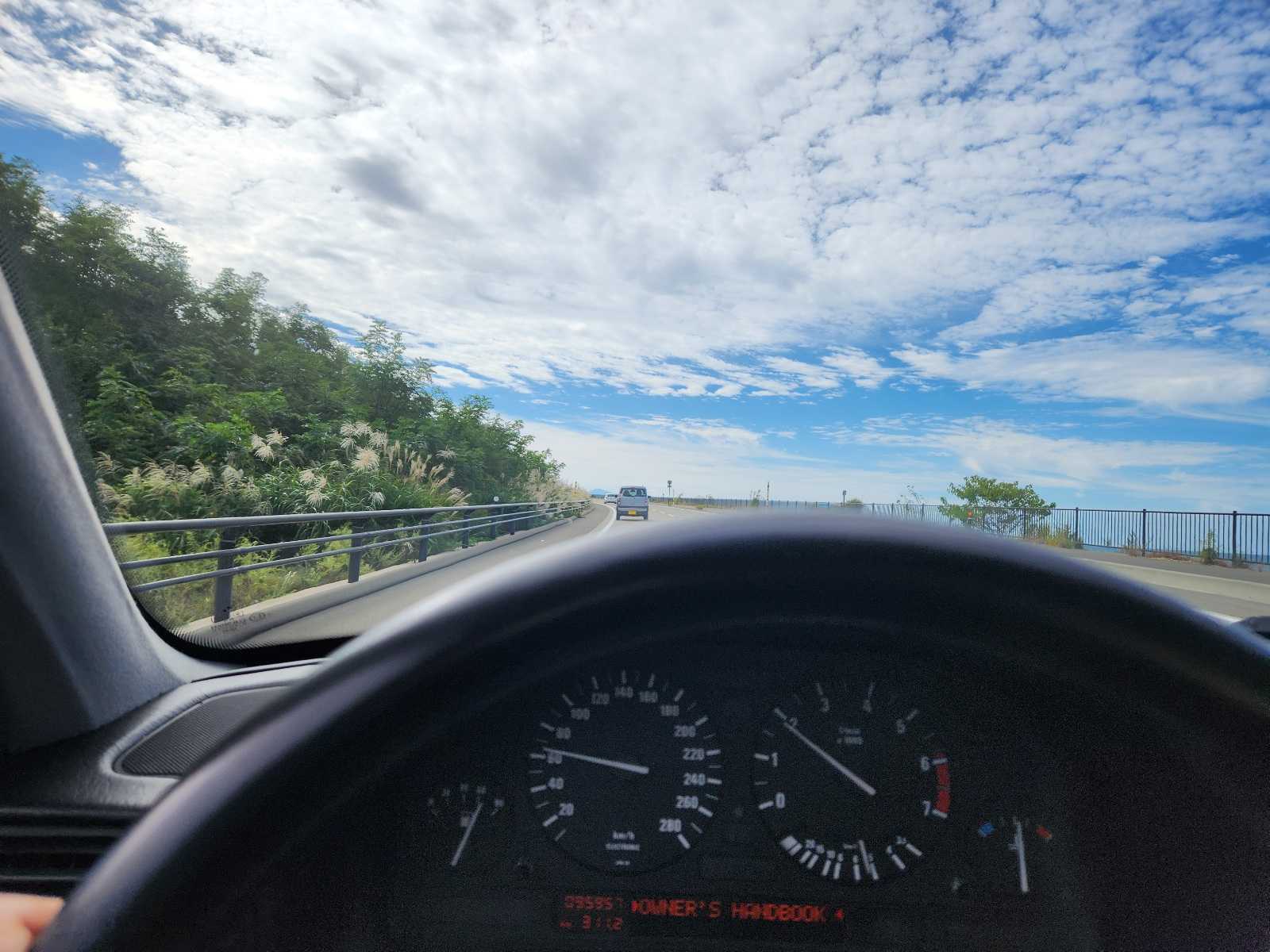 布団の中で5時半!起きたの6時ちょい前(苦笑)寝坊しました! 天気が良いなら早起きしなくっちゃね!(笑)ミケにエサをやって、見回り。枝がトゲトゲになるヤツ、見ないうちに身長より大きくなってる!?(驚)蕨が育って、プチジャングル(笑)晴れたら外仕事なのですが、やることあれこれあるのですが、、、2002MT 今年2回目のドライブ!02MTを走らせるには、出るのがだいぶ遅くなってしまいましたが、致し方がない! 走らせないよりは、いいだろう!(笑)6月の末に乗ったっきり、3ヵ月ぶりでした(苦笑)思ったほど、道が混んでません! それなりに踏めます(笑)鵜ノ崎海岸(笑)ほとんど凪ぎのことが多いのですが、今日は波が立ってます。 気持ちいいですねー(笑)。昨夜、雨風が凄かったのか、道路に結構な量の枝が落ちています。まだそんなに交通量が多くないこともあってか、枝を踏みます!(苦笑)アンダーコート剥がしてるので、床に弾けた枝の音がガコン! ゴン!と響きます(苦笑)リアのタイヤが坊主だったので、その辺を注意して走らせます。ホイールごと入れ換えするだけなのに…、やってません。白波が立ってますね。普段は海の方へ目をやることはないのですが、前が詰まるので減速して走らせます(苦笑)。思ったより、人がいました(爆)あっ、時間が遅いからかっ!?(笑) 明日休めば4連休になりますからね。結構な県外ナンバーがいました。入道崎で、同年代の観光でいらしているらしき二人組の方に声をかけられました。折角話し掛けてくれたので(失礼のないように)いろいろお話しましたが、ホント維持費ってかからないんですよねー、02って(笑)