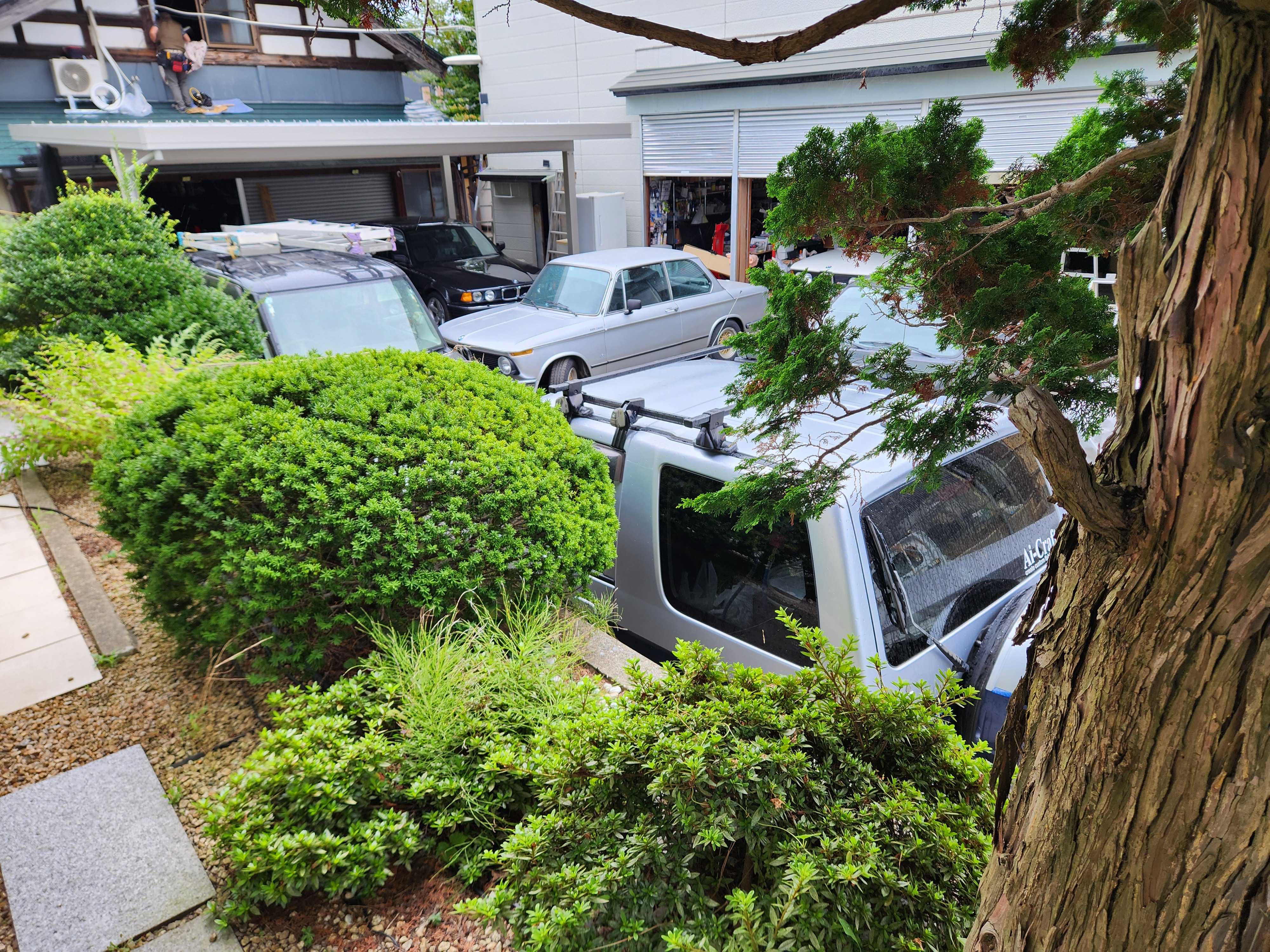 今朝です。やはり5時には活動開始!(笑)今日は曇りのち雨の予報。ん、よそのチビにゃん(笑)虫除けスプレー全身にかけて、作業に入ります。少し涼しくなったら蚊も活動開始したようです。手にスプレーしておでこにも耳にも塗りました(笑)今日は、全てのシャッター開けます(笑)猫、入らないでくださいね。アテンザ寄せて、軽トラを寄せて、2002AT出してE30カブリオレを小屋から出します。カブリオレ、1発始動!(笑)ついでなので、エアーを入れます。1.3しか入っていませんでした(苦笑)E30もかなり減ってます。ミケ、来ないなぁと思ったら寝てました!(笑)9時過ぎ、いらっしゃいました。準備、間に合いました(笑)。業者の方の車が2台考えながら出したかいがあって、うまく収まりました(笑)取り外してしばらく置いていたエアコンを、この度取り付けていただくことにしましたが、うまく行かなければ二度手間、料金も二重に掛かることになります(苦笑)お願いだから、うまく行ってくれ~~。
