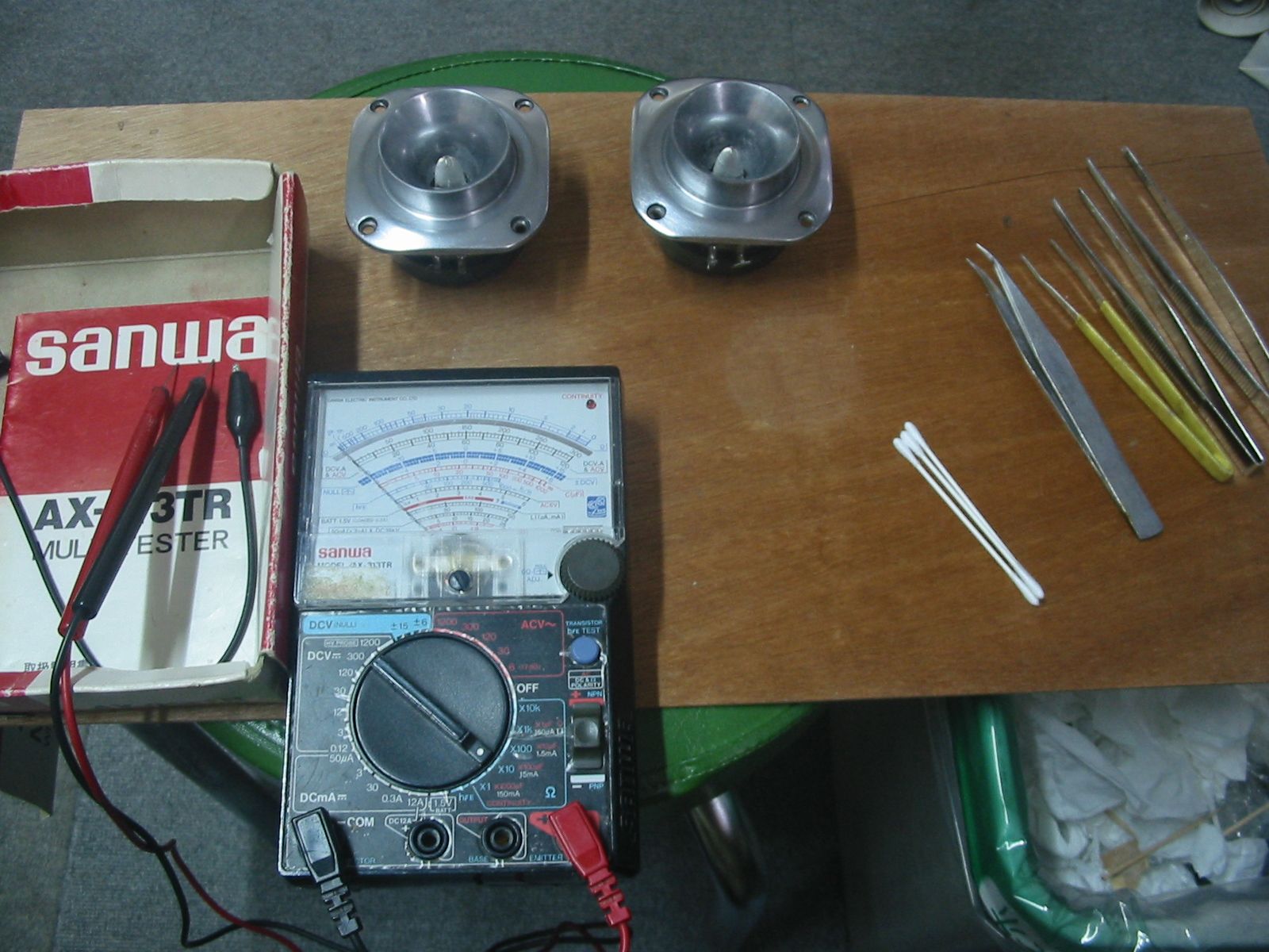 取り合えずボイスコイルの断線とダイアフラムの状態のチェックでは、抵抗値は正常値を示し、ダイアフラムの方も、付着している綿埃を取り除けば何とかいけそうな感じです。