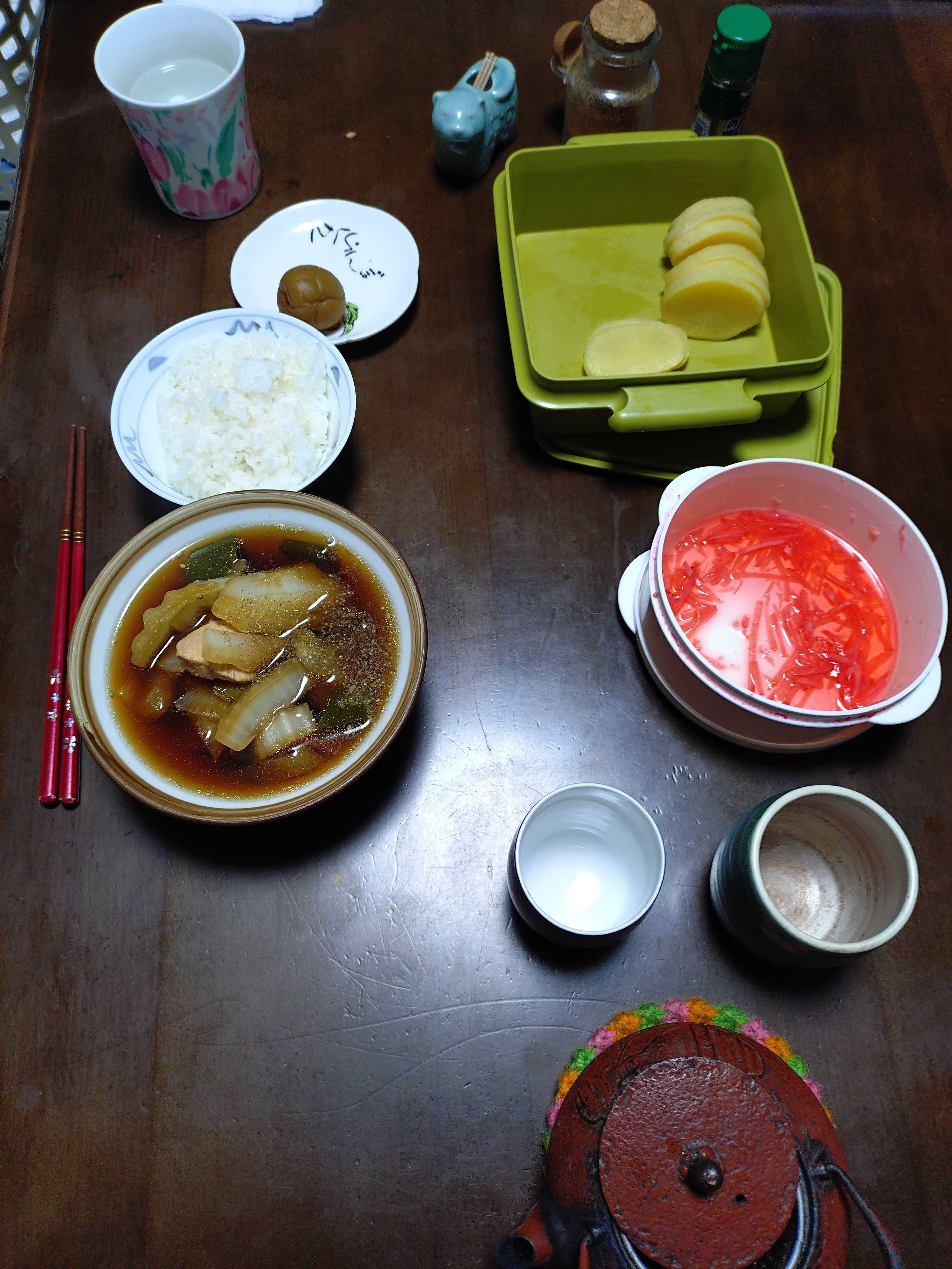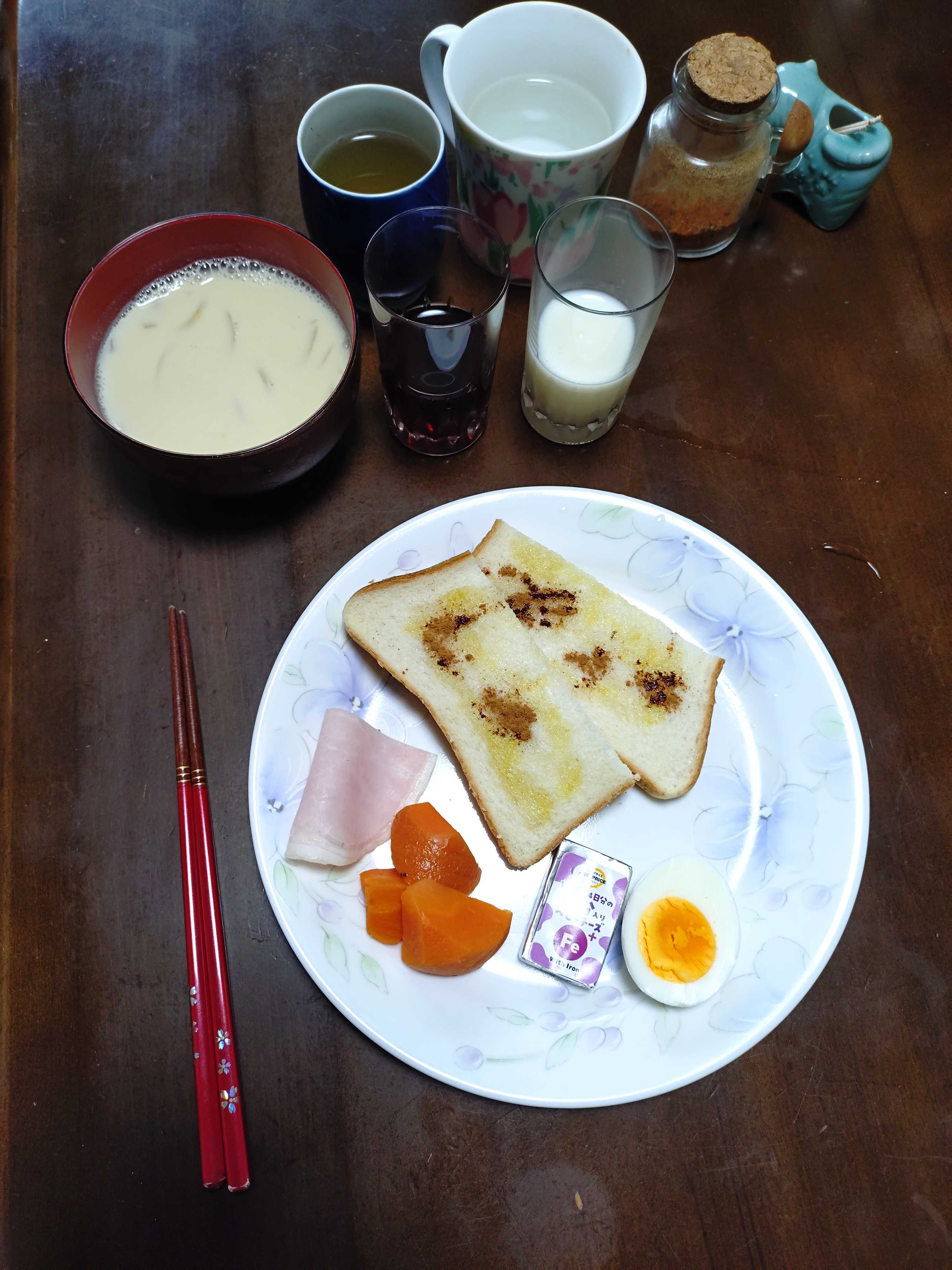 朝食 トースト8枚切り1枚オリーブオイル蜂蜜シナモン ハム 茹で人参 チーズ 茹で卵 ヨーグルト ブドウジュース 緑茶 味噌汁豆乳仕立て夕食 沢庵 紅生姜 白菜と鳥肉の鍋物風 ご飯発芽玄米入り 梅酒の梅