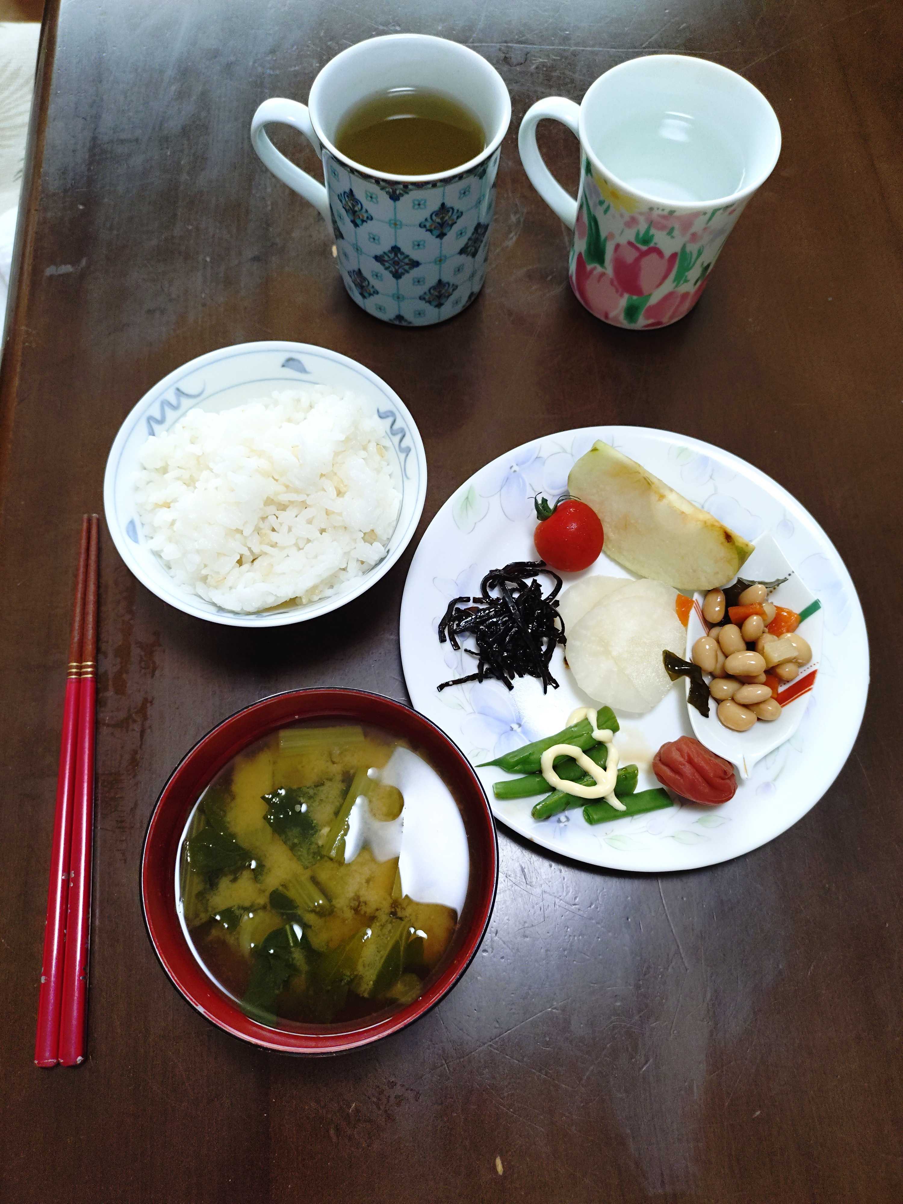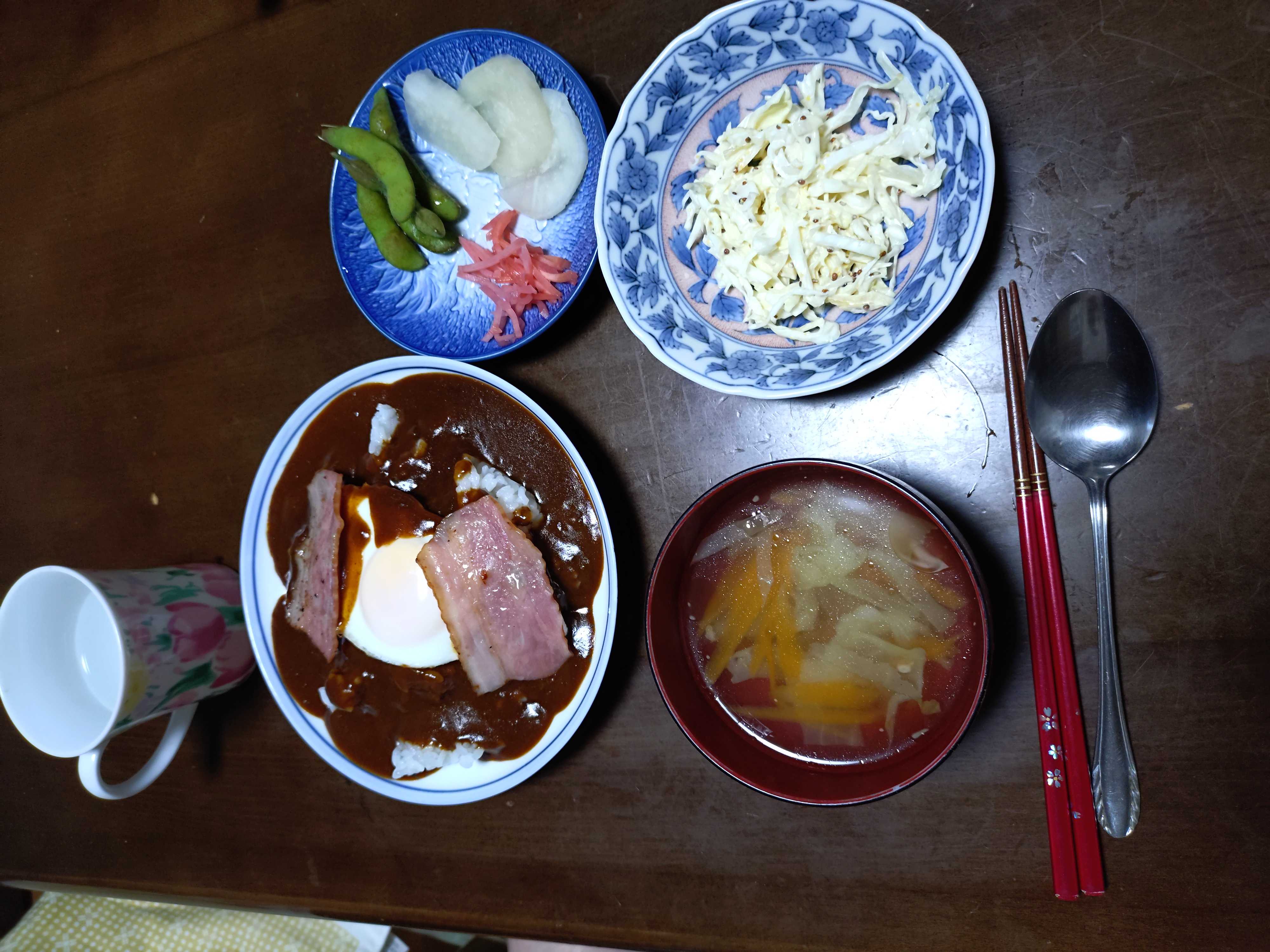 トースト8枚切り1枚 オリーブオイル蜂蜜シナモン 梨 プチトマト サラダチキン 枝豆 沢庵 ヨーグルト リンゴジュース 緑茶 味噌汁豆乳仕立て昼食 梨 豆煮物 梅干し インゲン和え 昆布つくだ煮 沢庵 ご飯発芽玄米入り 味噌汁夕食 コールスローサラダ 枝豆 沢庵 紅生姜 カレーライスレトルト ベーコン 目玉焼き 味噌汁