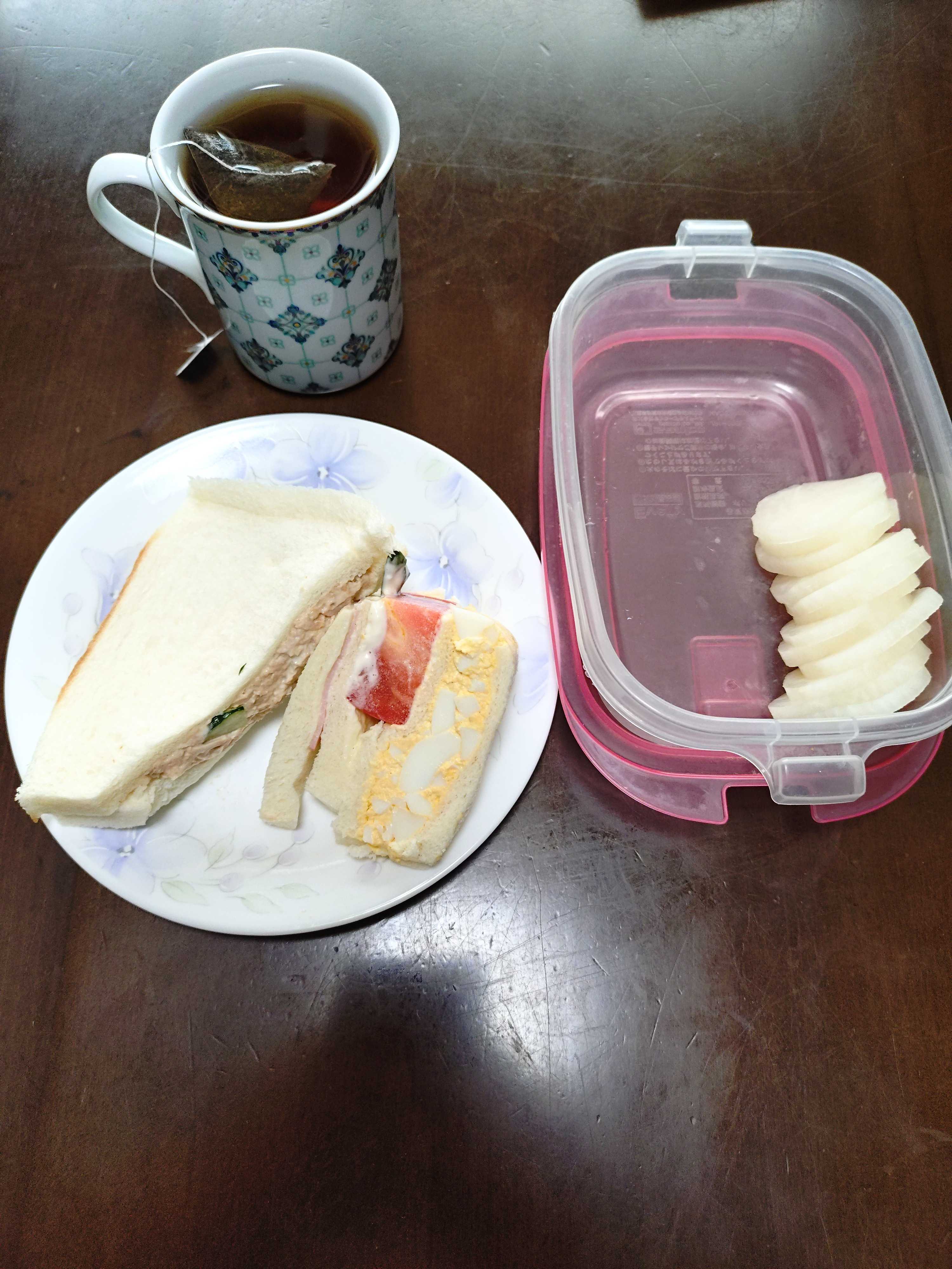 トースト8枚切り1枚 オリーブオイル蜂蜜シナモン サラダチキン プチトマト 枝豆 沢庵ヨーグルト リンゴジュース 緑茶 味噌汁豆乳仕立て昼食 ツナサンド ミックスサンド(ポポー) 沢庵 紅茶夕食 梅しそハンバーグ弁当 デイサービスのスペシャル弁当 沢庵 味噌汁