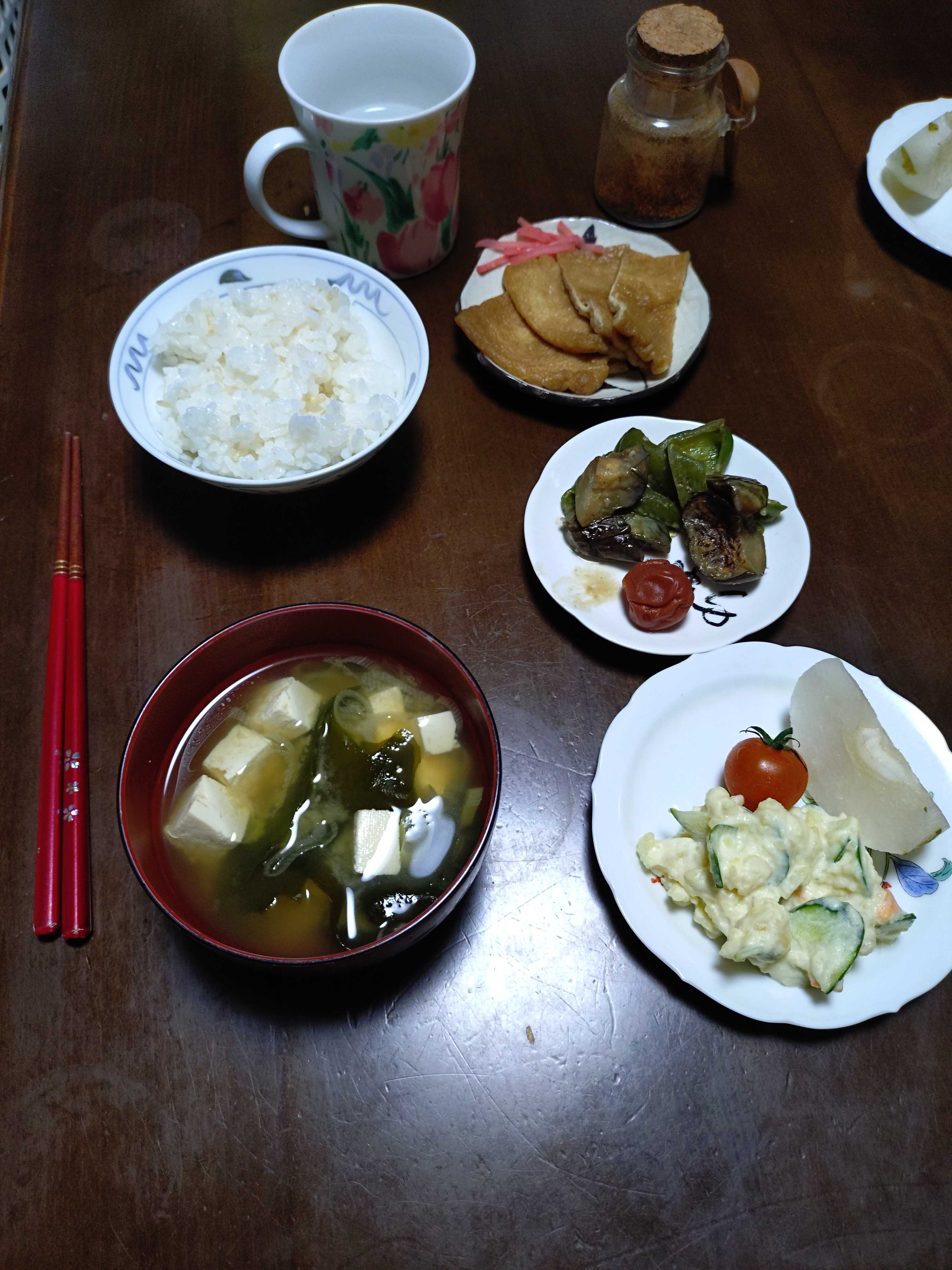 トースト8枚切り1枚オリーブオイル蜂蜜シナモン チーズ プチトマト 枝豆 梨 ヨーグルト リンゴジュース 緑茶 味噌汁豆乳仕立て夕食 油揚げの煮物 茄子ピーマン味噌炒め 梅干し ポテトサラダ 梨 ご飯発芽玄米入り 味噌汁