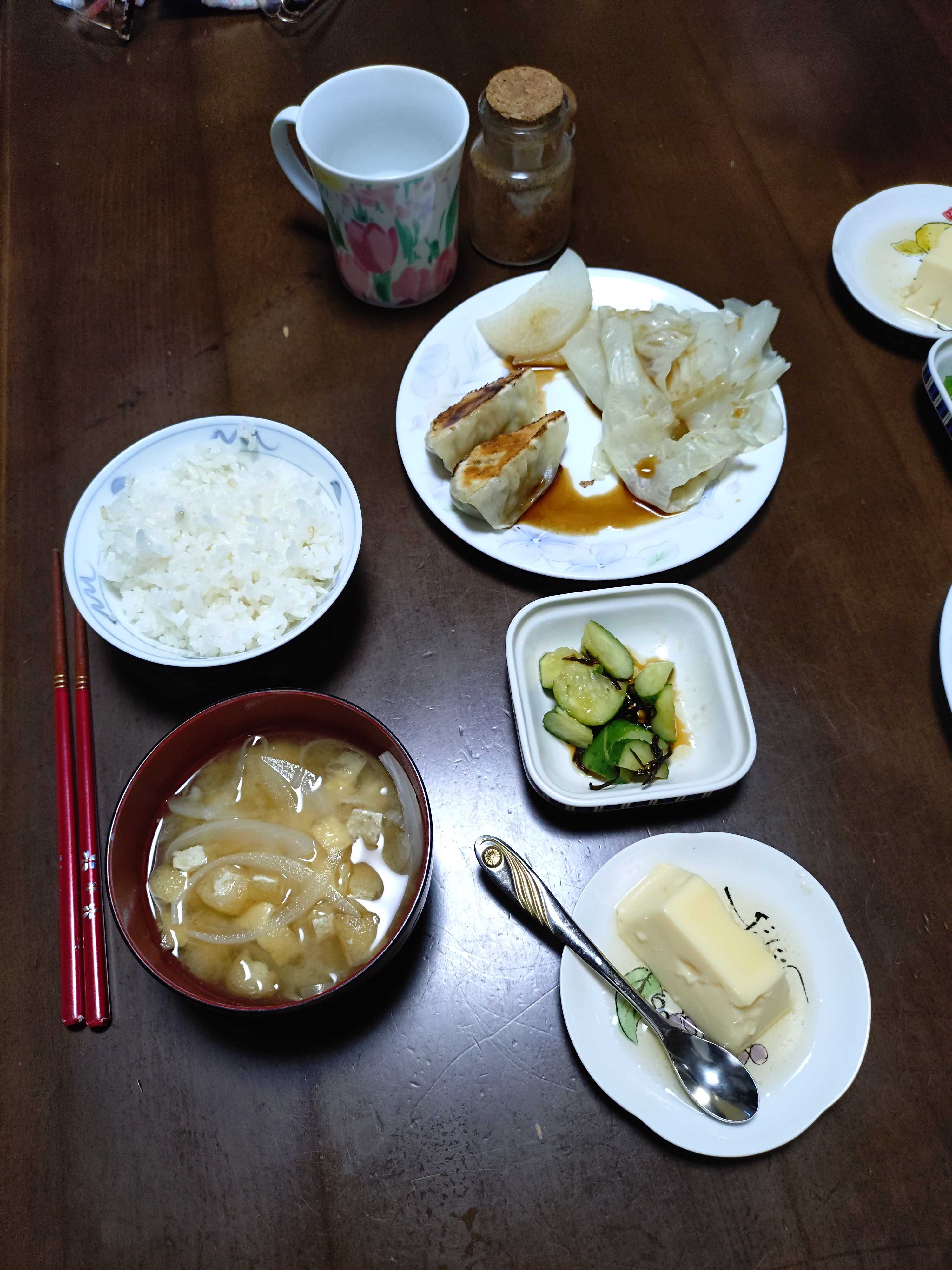 トースト8枚切り1枚オリーブオイル蜂蜜シナモン ブドウ チーズ 枝豆 沢庵 ヨーグルト リンゴジュース 緑茶 味噌汁豆乳仕立て夕食 餃子 茹で大根 茹でキャベツ(昆布ポン酢) キュウリ塩こんぶ タマゴ豆腐 ご飯発芽玄米入り 味噌汁