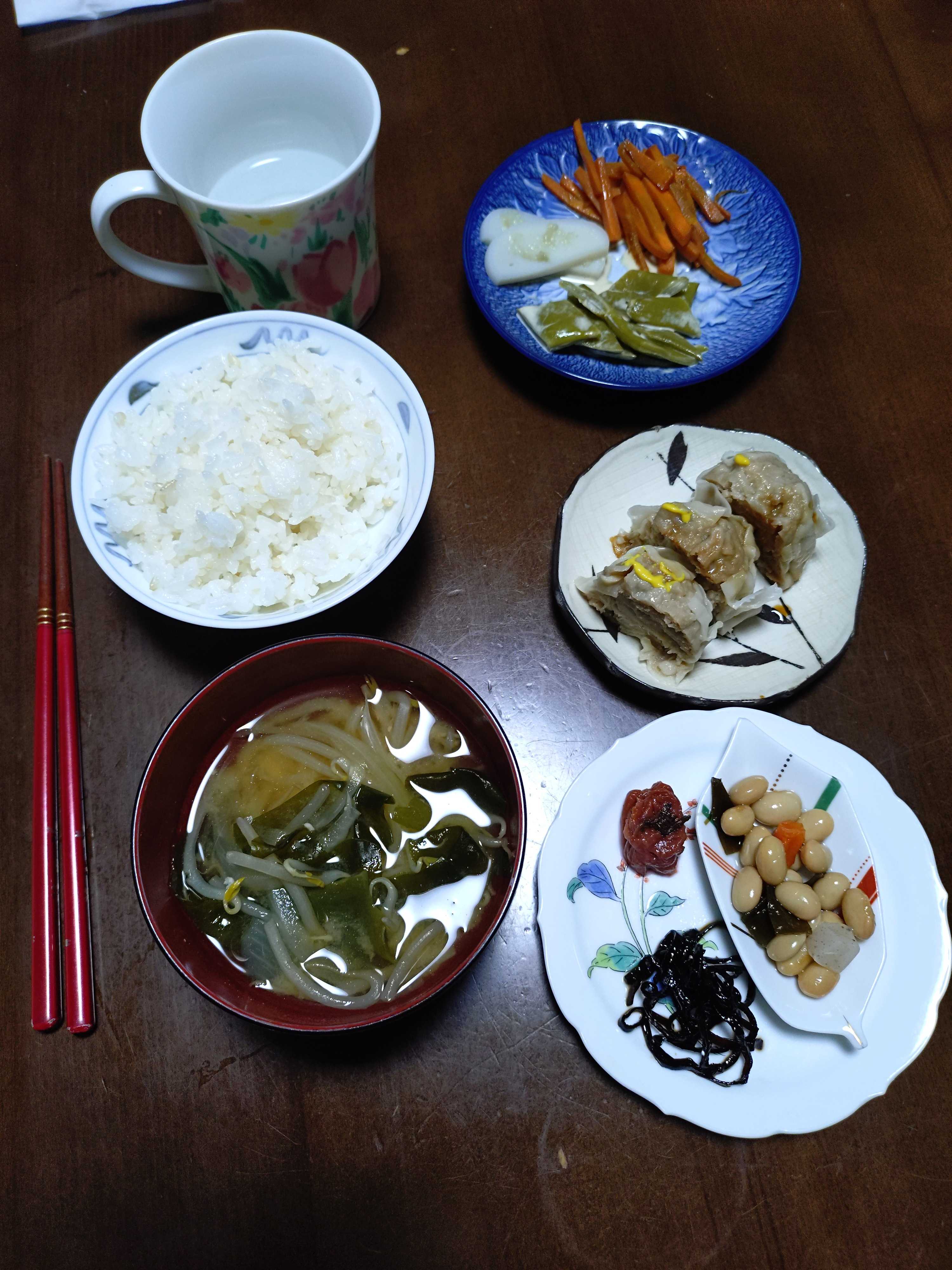 トースト8枚切り1枚オリーブオイル蜂蜜シナモン チーズ プチトマト モロッコインゲン ヨーグルト リンゴジュース 緑茶 味噌汁豆乳仕立て夕食 人参きんぴら モロッコインゲン和え かまぼこ 餃子 煮豆 昆布つくだ煮 梅干し ご飯発芽玄米入り 味噌汁