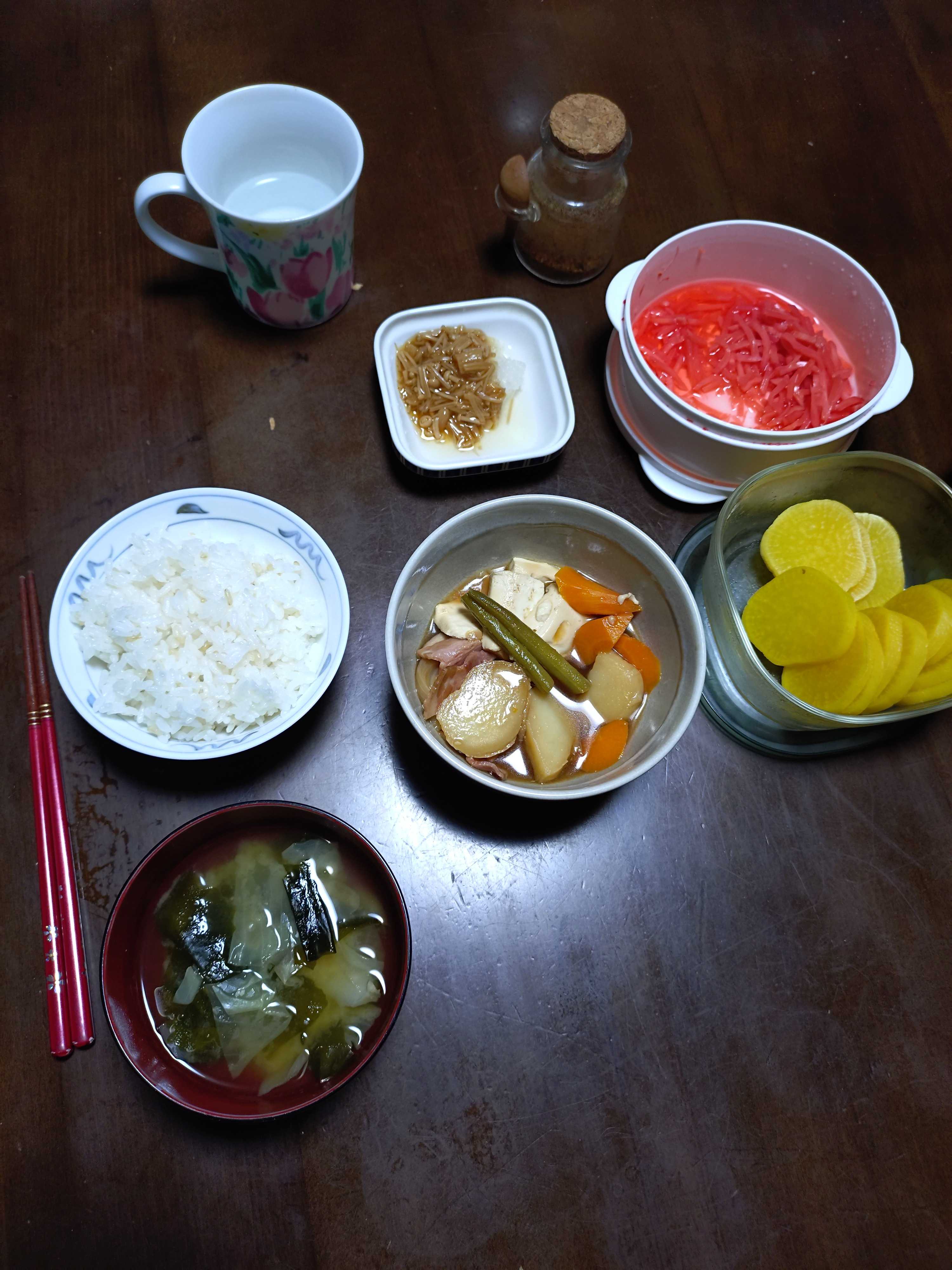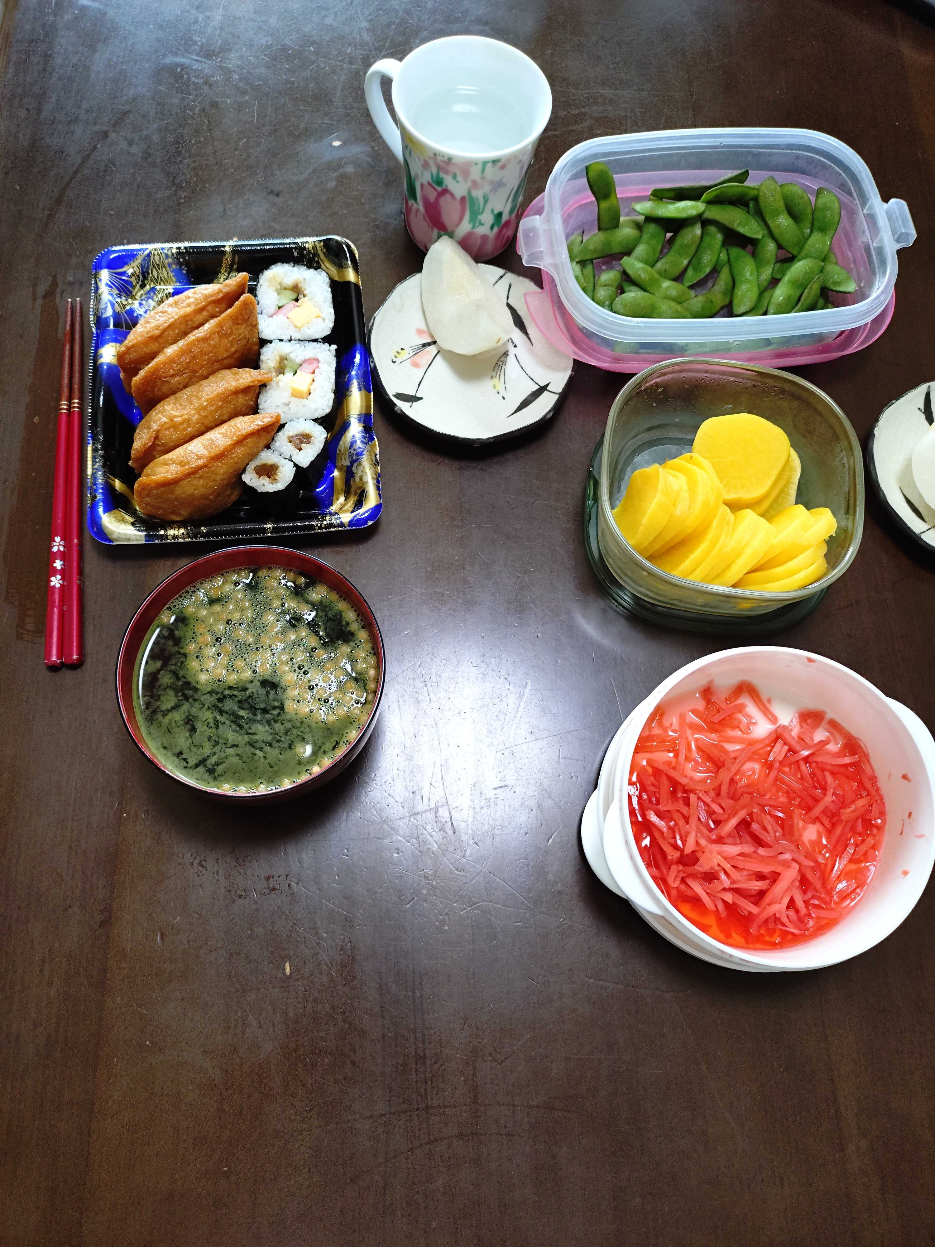 トースト8枚切り1枚オリーブオイル蜂蜜シナモン 枝豆 チーズ 茹で人参 梨 ヨーグルト リンゴジュース 緑茶 味噌汁豆乳仕立て昼食 枝豆 沢庵 紅生姜 梨 助六寿司 お吸い物 お茶漬けのもと溶いただけ夕食 紅生姜 沢庵 ナメコおろし 野菜ベーコン煮物 ご飯発芽玄米入り 味噌汁