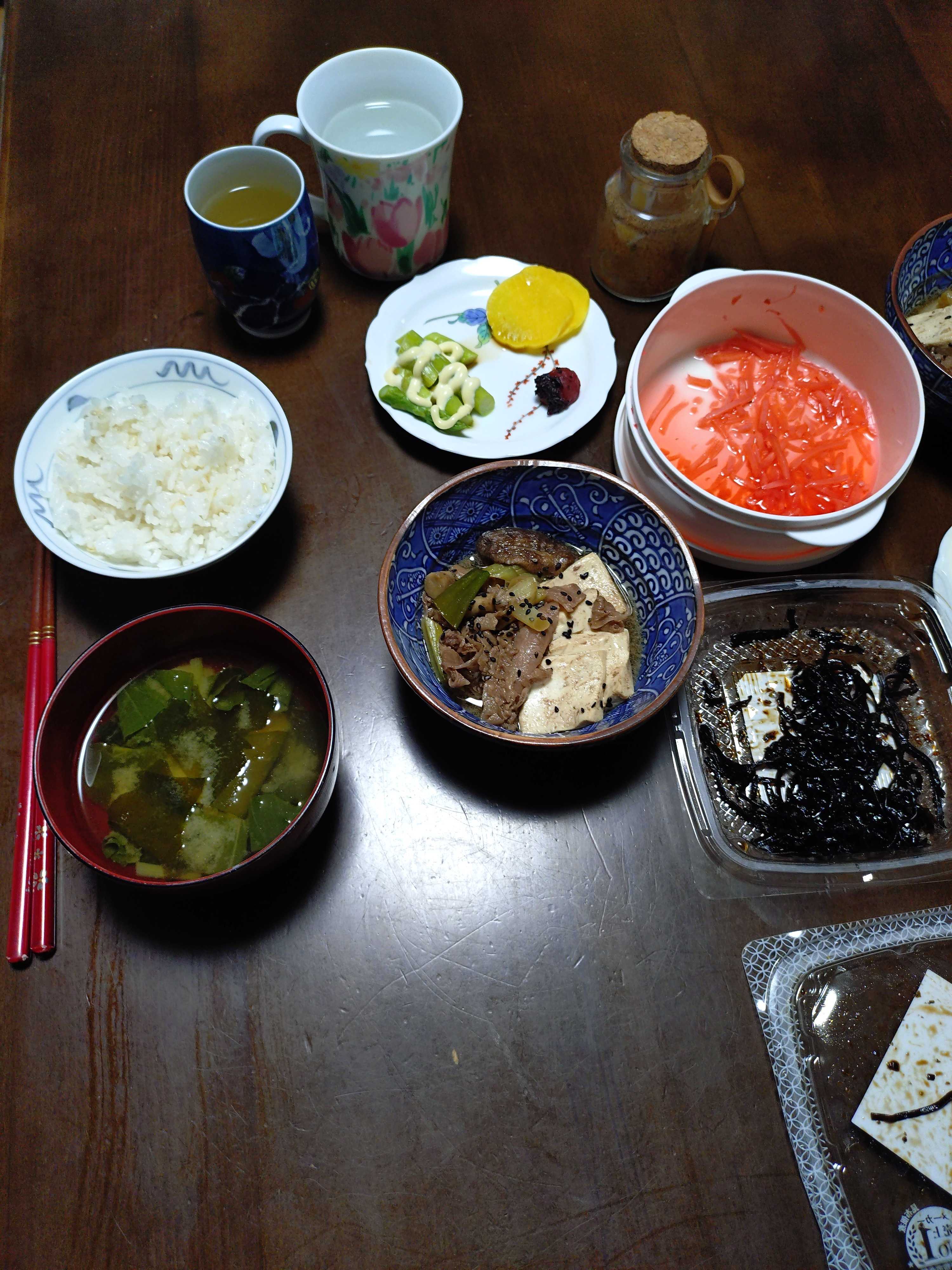 トースト8枚切り1枚オリーブオイル蜂蜜シナモン 茹で人参 キウイ ハム 枝豆 リンゴジュース ヨーグルト 緑茶 味噌汁豆乳仕立て夕食 沢庵 梅干し インゲンマヨ 紅生姜 昆布つくだ煮 牛肉煮物 ご飯発芽玄米入り 味噌汁