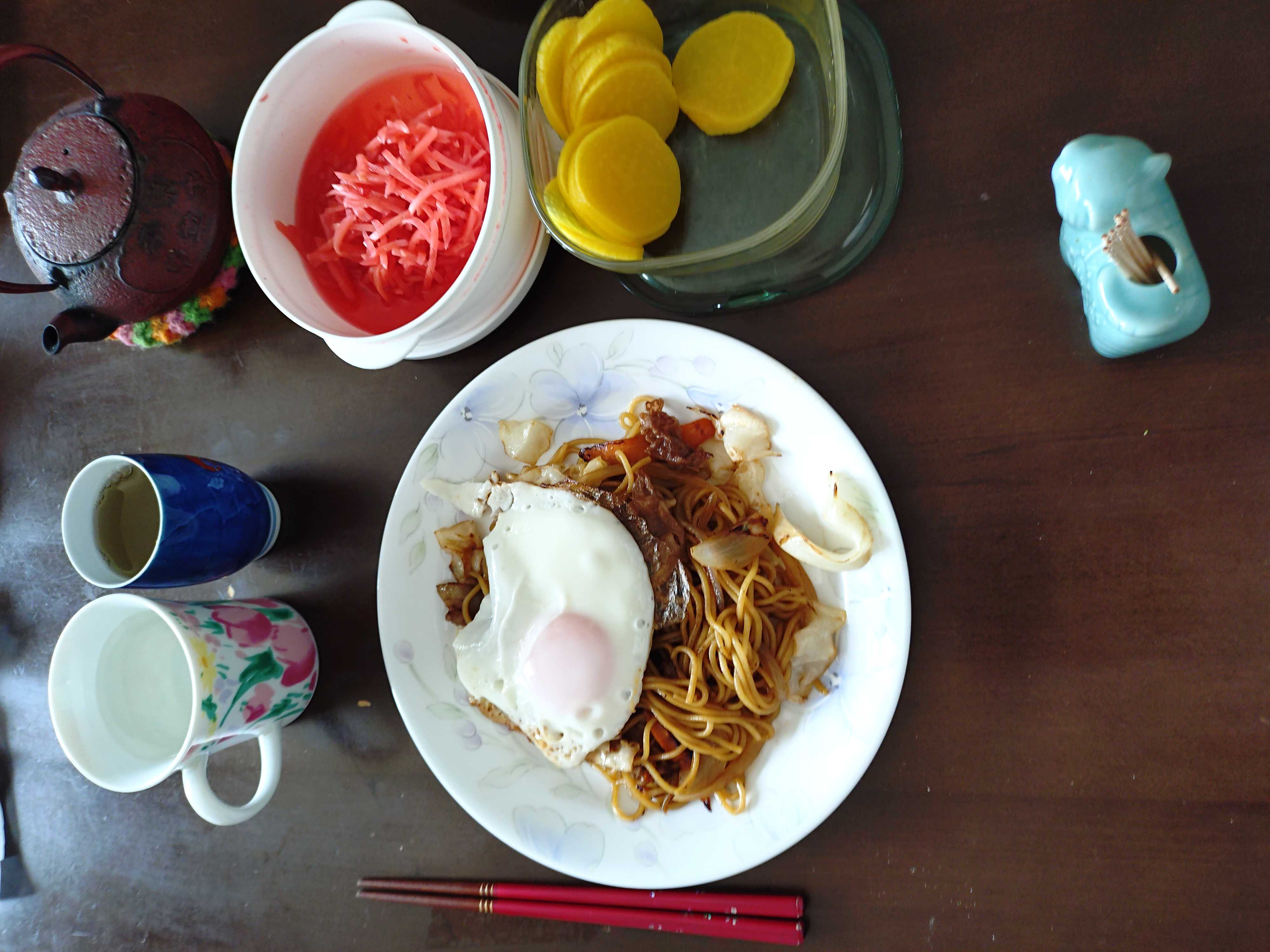 トースト8枚切り1枚オリーブオイル蜂蜜シナモン チーズ ハム キウイ 枝豆 ヨーグルト リンゴジュース 緑茶🍵 味噌汁豆乳仕立て昼食 紅生姜 沢庵 ヤキソバ マルちゃん 目玉焼き 緑茶夕食 蒸し野菜 キャベツ 大根 ジャガイモ しらすおろし 油揚げ おろし 紅生姜 ご飯発芽玄米入り 味噌汁