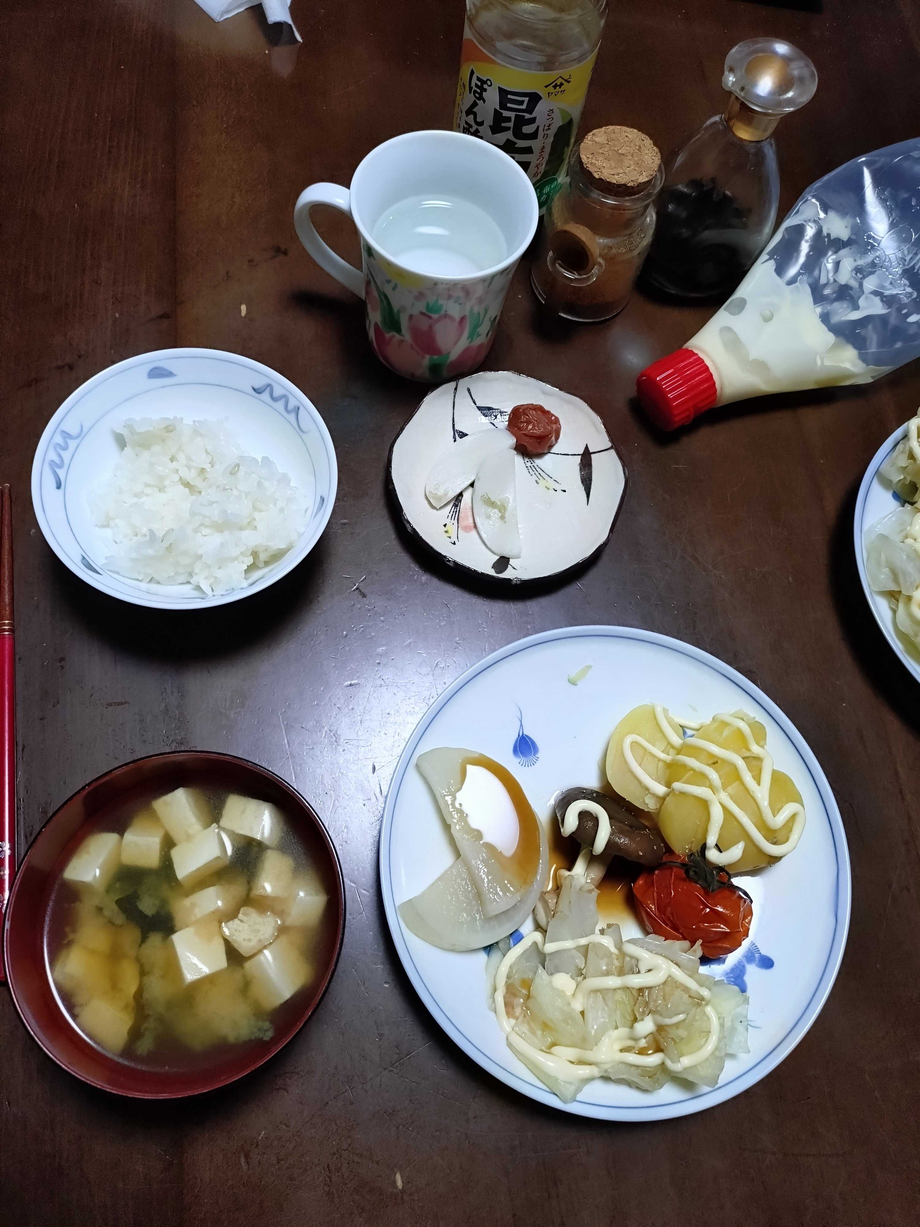 トースト8枚切り1枚オリーブオイル蜂蜜シナモン プチトマト チーズ ハム 柿 枝豆 人参マンゴージュース コーヒー 緑茶 味噌汁豆乳仕立て昼食 紅生姜 金時豆 沢庵 うるめいわし おにぎり シャケうめ インスタント味噌汁 しじみ夕食 カマボコ 梅干し ジャガイモ シイタケ プチトマト 大根 キャベツ ご飯発芽玄米入り 味噌汁