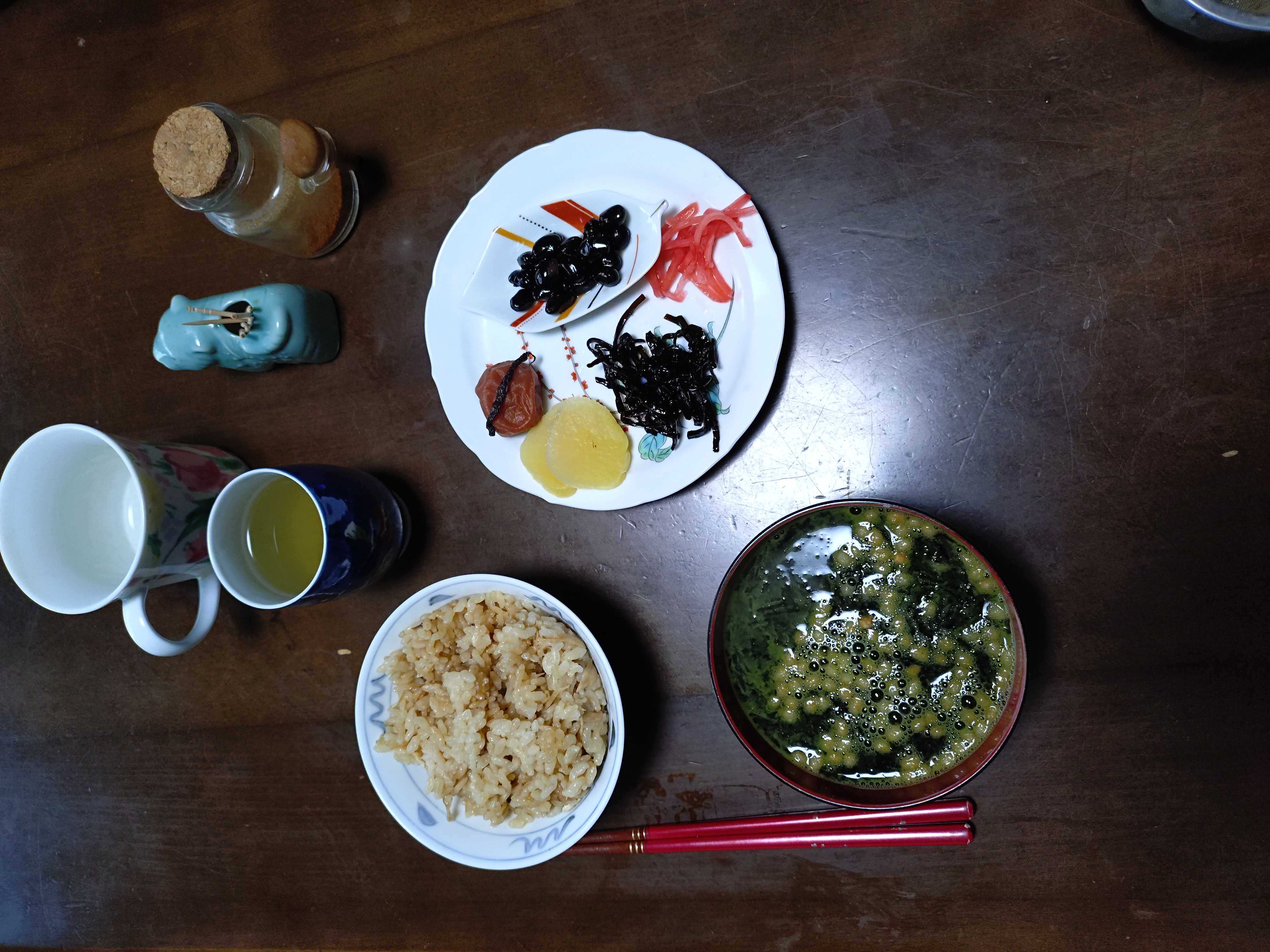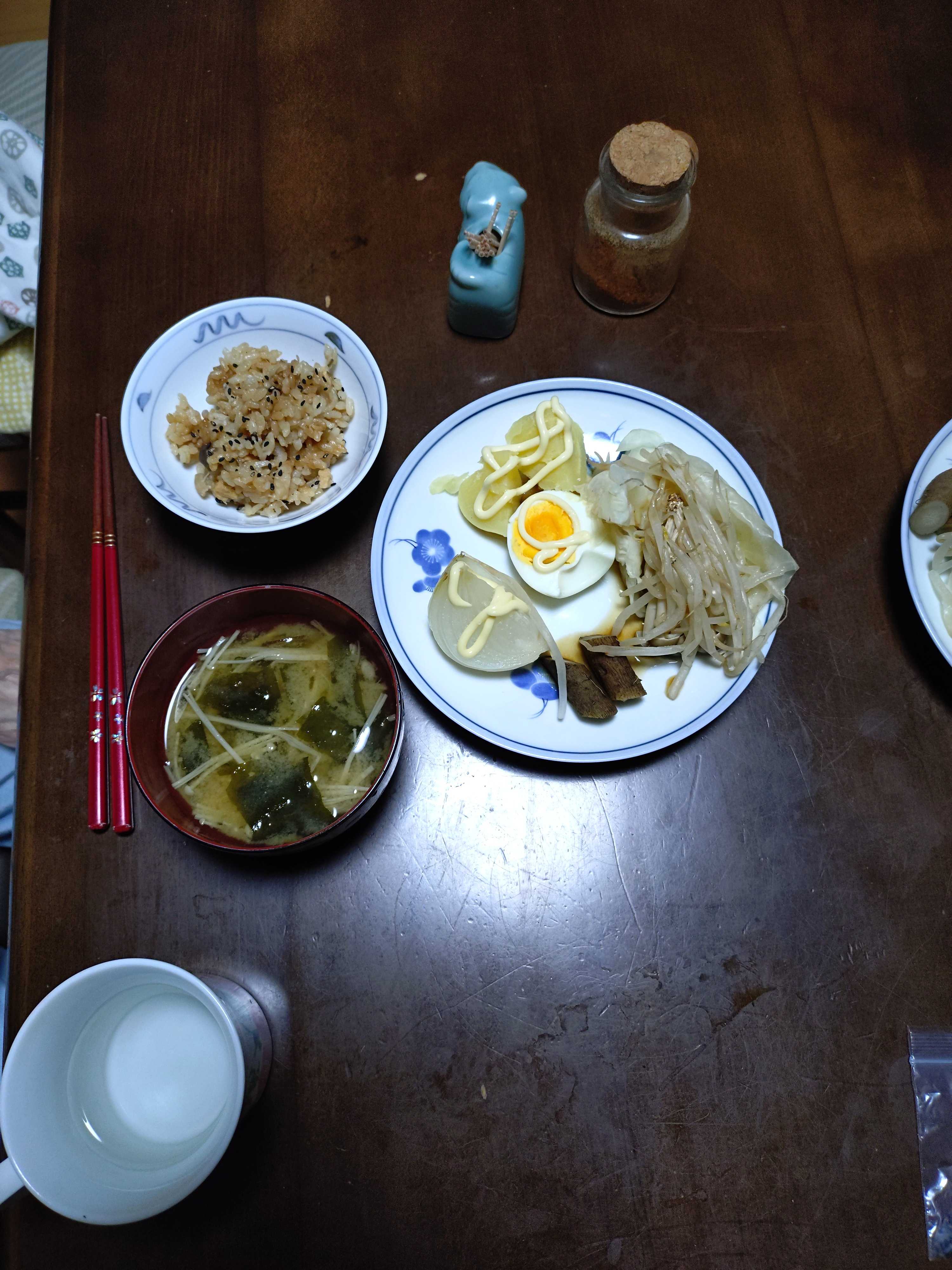 トースト8枚切り1枚オリーブオイル蜂蜜シナモン チーズ プチトマト ハム 茹で人参 枝豆 ヨーグルト ブドウジュース コーヒー 緑茶 味噌汁豆乳仕立て昼食 黒豆 紅生姜 昆布つくだ煮 沢庵 梅干し 炊き込みご飯 お吸い物 お茶漬けのもとにお湯いれただけ夕食 茹で野菜 ジャガイモ キャベツ シイタケ 大根 もやし 卵 マヨ昆布ポン酢 炊き込みご飯 味噌汁