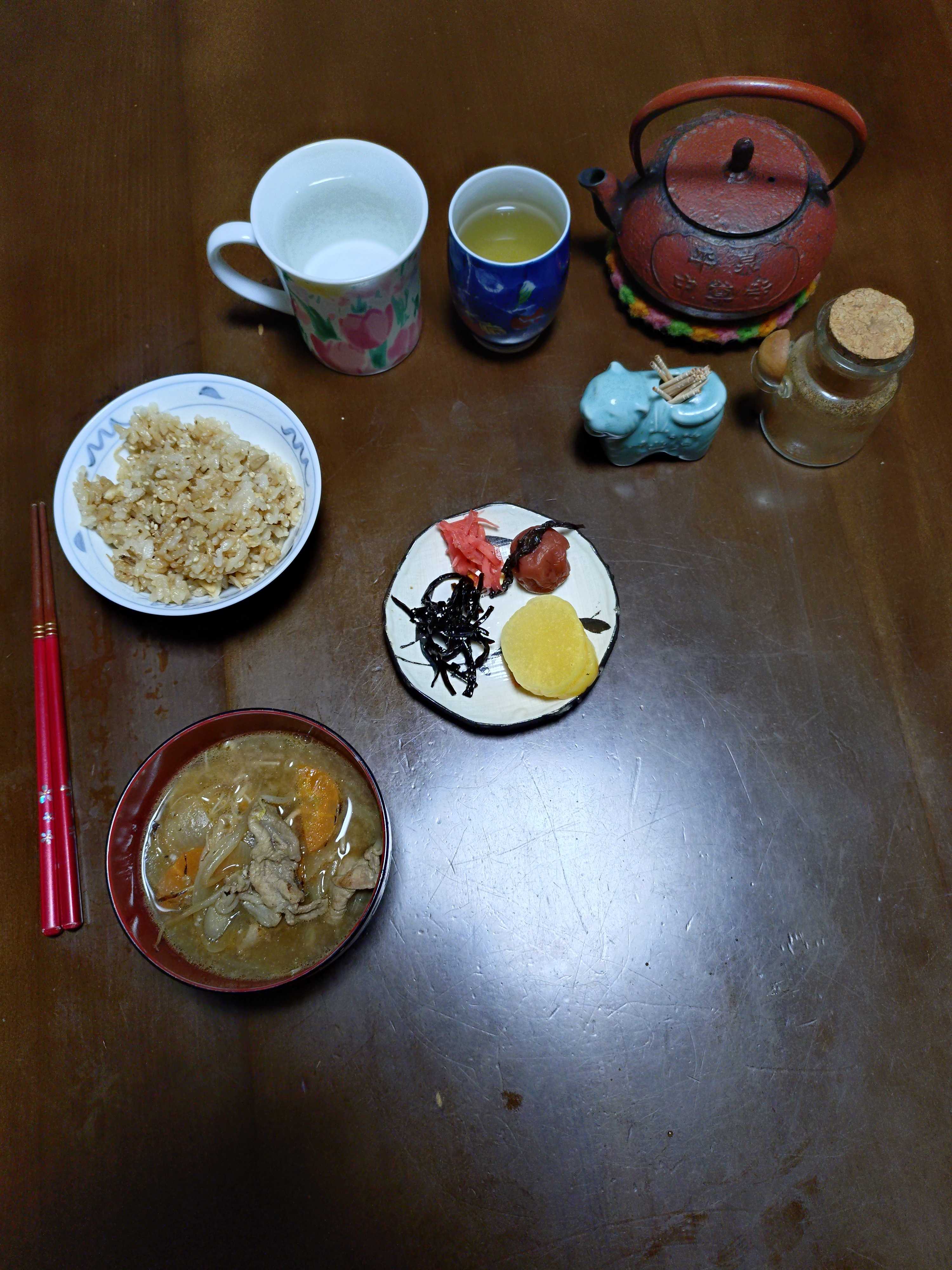 トースト8枚切り1枚オリーブオイル蜂蜜シナモン プチトマト チーズ 枝豆 茹で人参 ハム ヨーグルト ブドウジュース 緑茶 味噌汁豆乳仕立て夕食 梅干し 沢庵 昆布つくだ煮 紅生姜 炊き込みご飯発芽玄米入り 豚汁