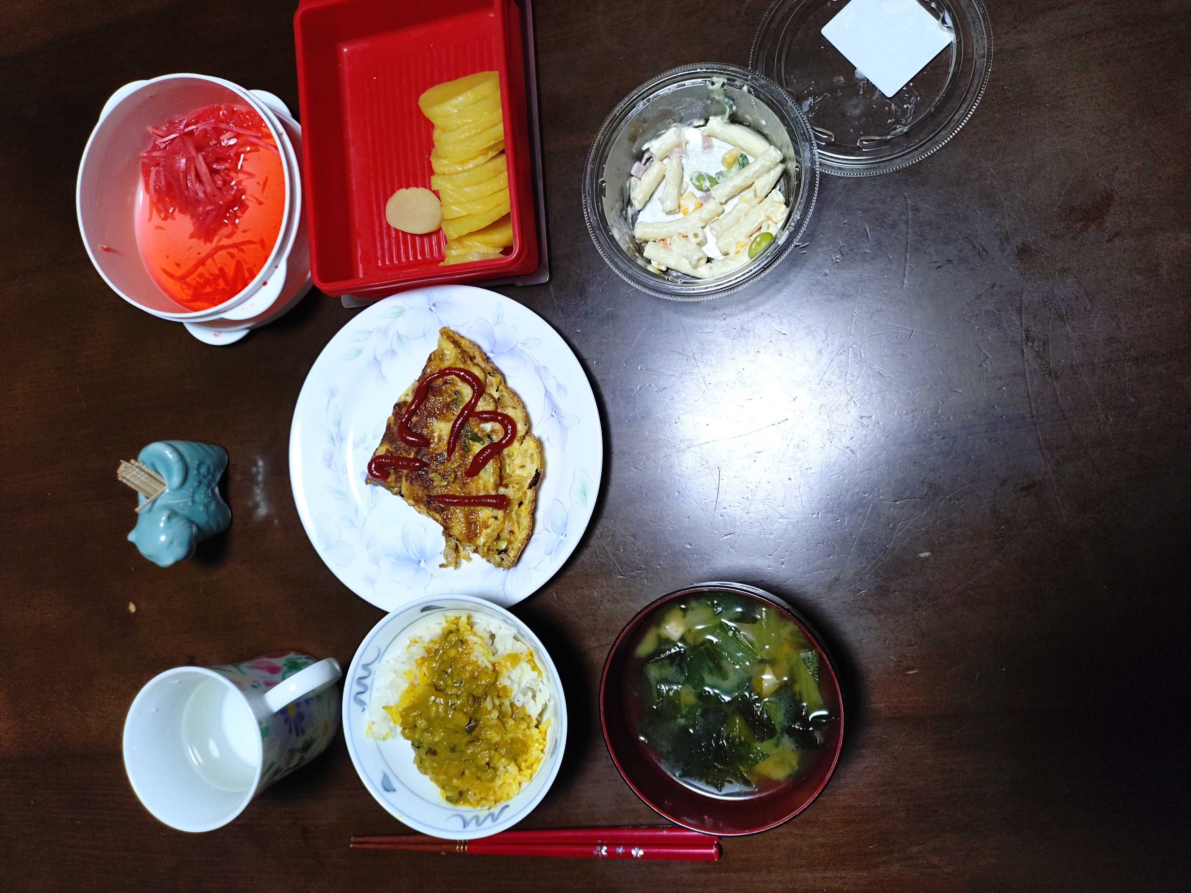 トースト8枚切り1枚オリーブオイル蜂蜜シナモン プチトマト チーズ 茹で人参 枝豆 ハム ヨーグルト ブドウジュース 緑茶 味噌汁豆乳仕立て夕食 紅生姜 沢庵 マカロニサラダ オムレツ スペイン風? チキンカレー サフランライス ネパール ご飯発芽玄米入り 味噌汁