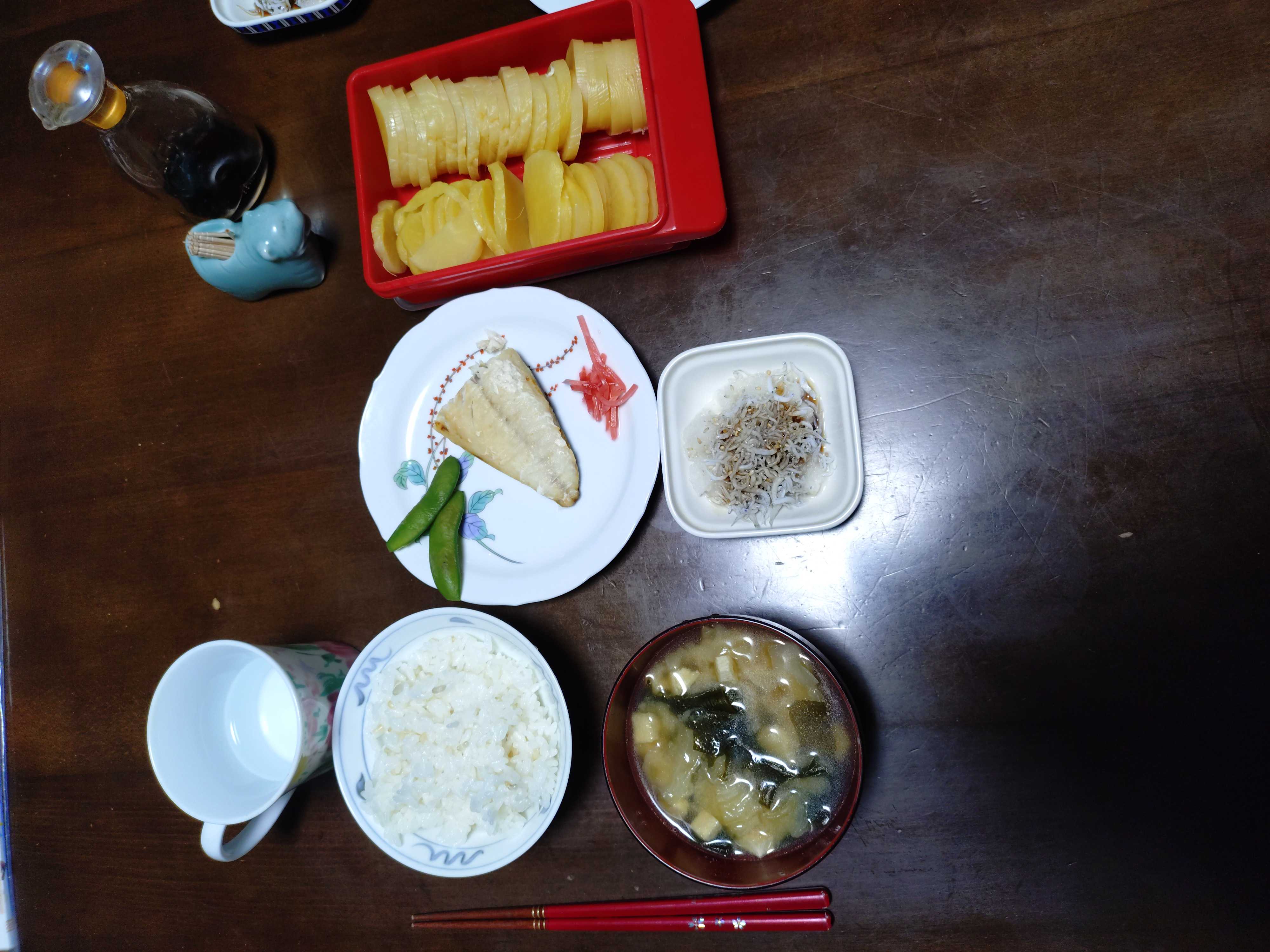 トースト8枚切り1枚オリーブオイル蜂蜜 チーズ プチトマト 茹で人参 ハム ヨーグルト ブドウジュース 緑茶 味噌汁豆乳仕立て夕食 沢庵 サバ焼き 紅生姜 枝豆 しらすおろし ご飯発芽玄米入り 味噌汁