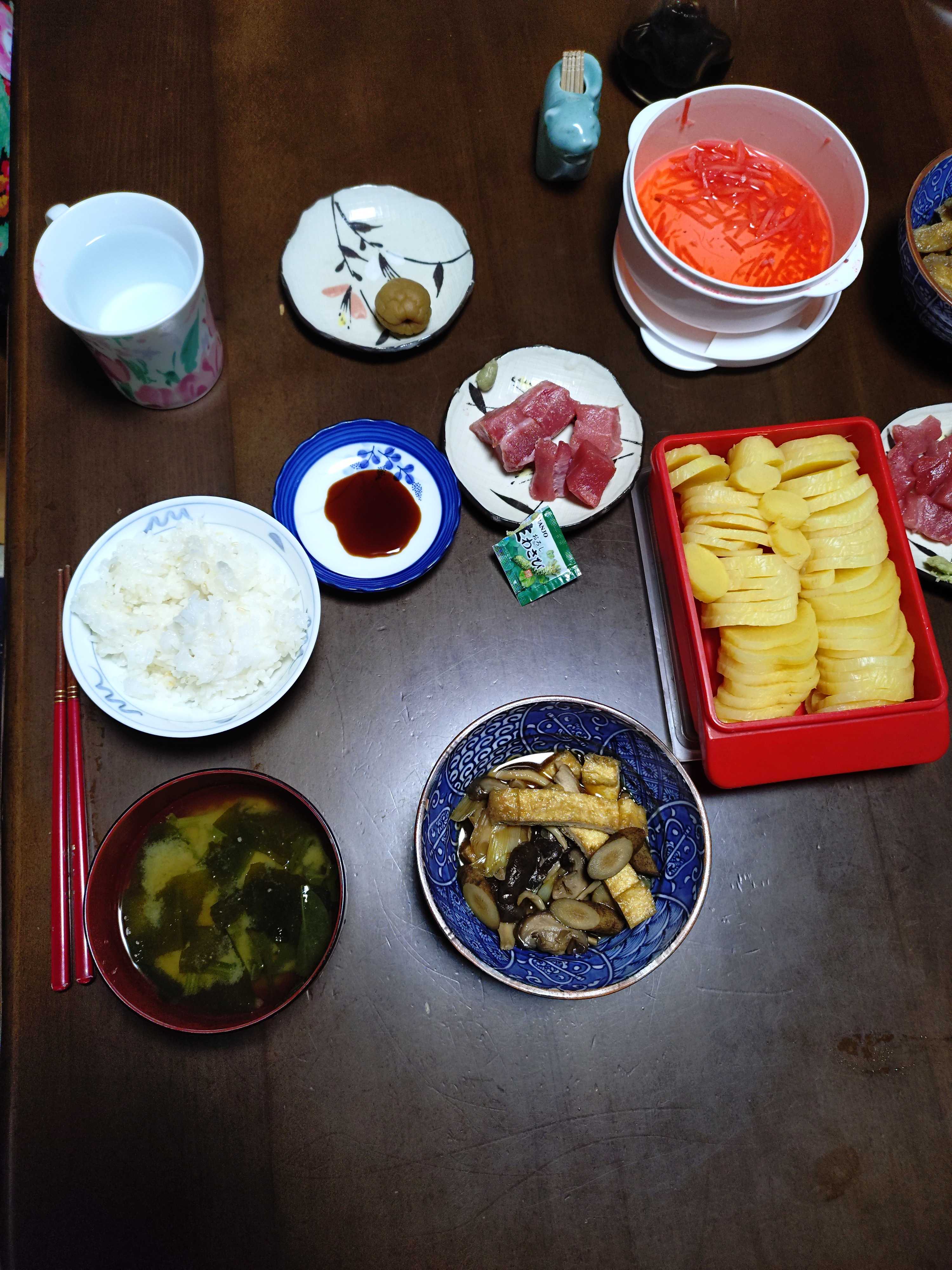 紅生姜 枝豆 カレーライスレトルト 沢庵 目玉焼き 味噌汁夕食 紅生姜 沢庵 マグロ 中トロ 油揚げ野菜煮物 梅酒の梅 ご飯発芽玄米入り 味噌汁