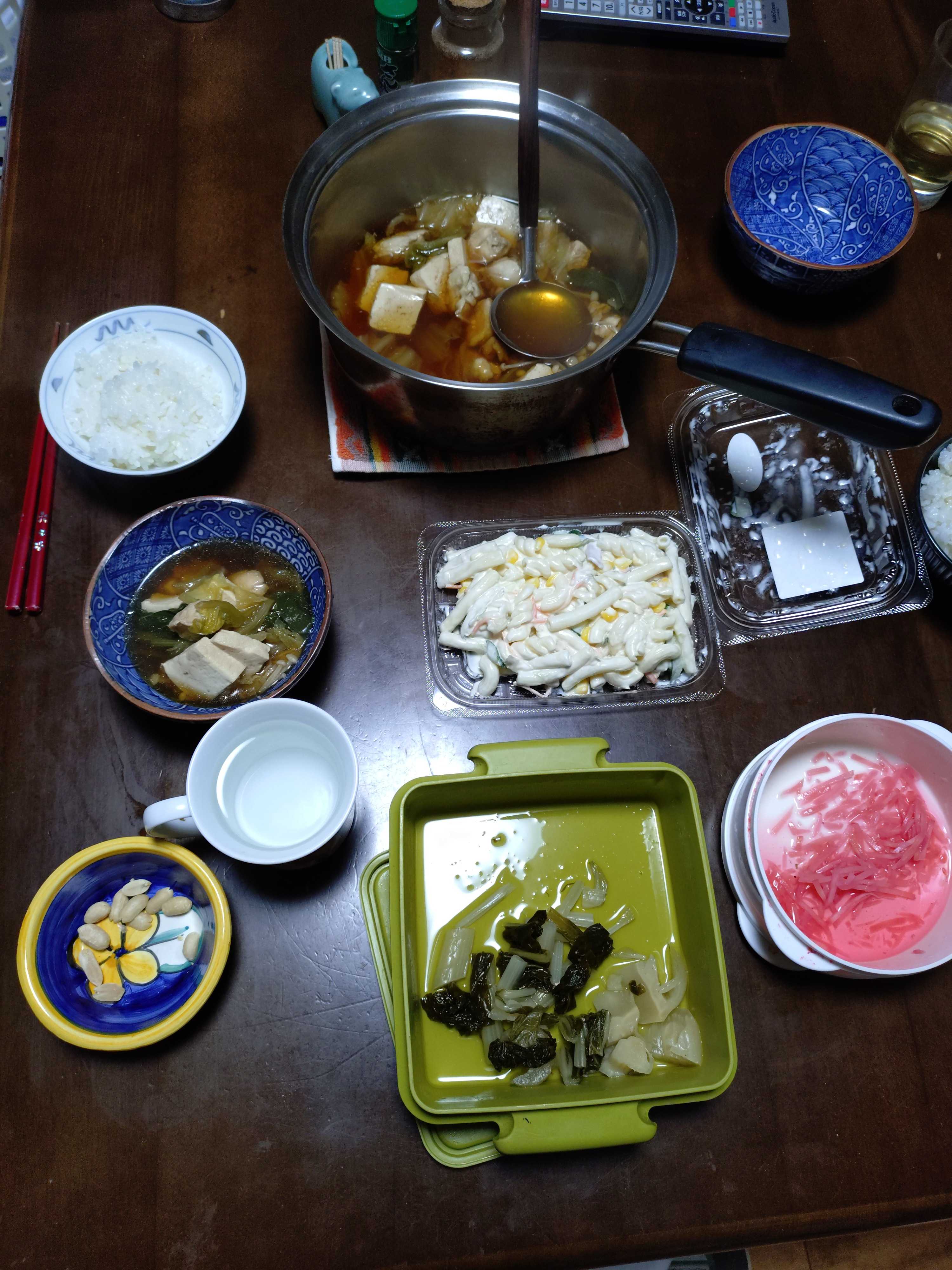 納豆 ハム 焼きのり 煮豆 梅干し 昆布つくだ煮 ヨーグルト ブドウジュース 緑茶 ご飯発芽玄米入り 炊き込みご飯発芽玄米入り 味噌汁豆乳仕立て昼食 紅生姜 杓子菜漬け インスタントラーメン サッポロ一番醤油夕食 紅生姜 マカロニサラダ 杓子菜漬け タラの鍋風 ご飯発芽玄米入り