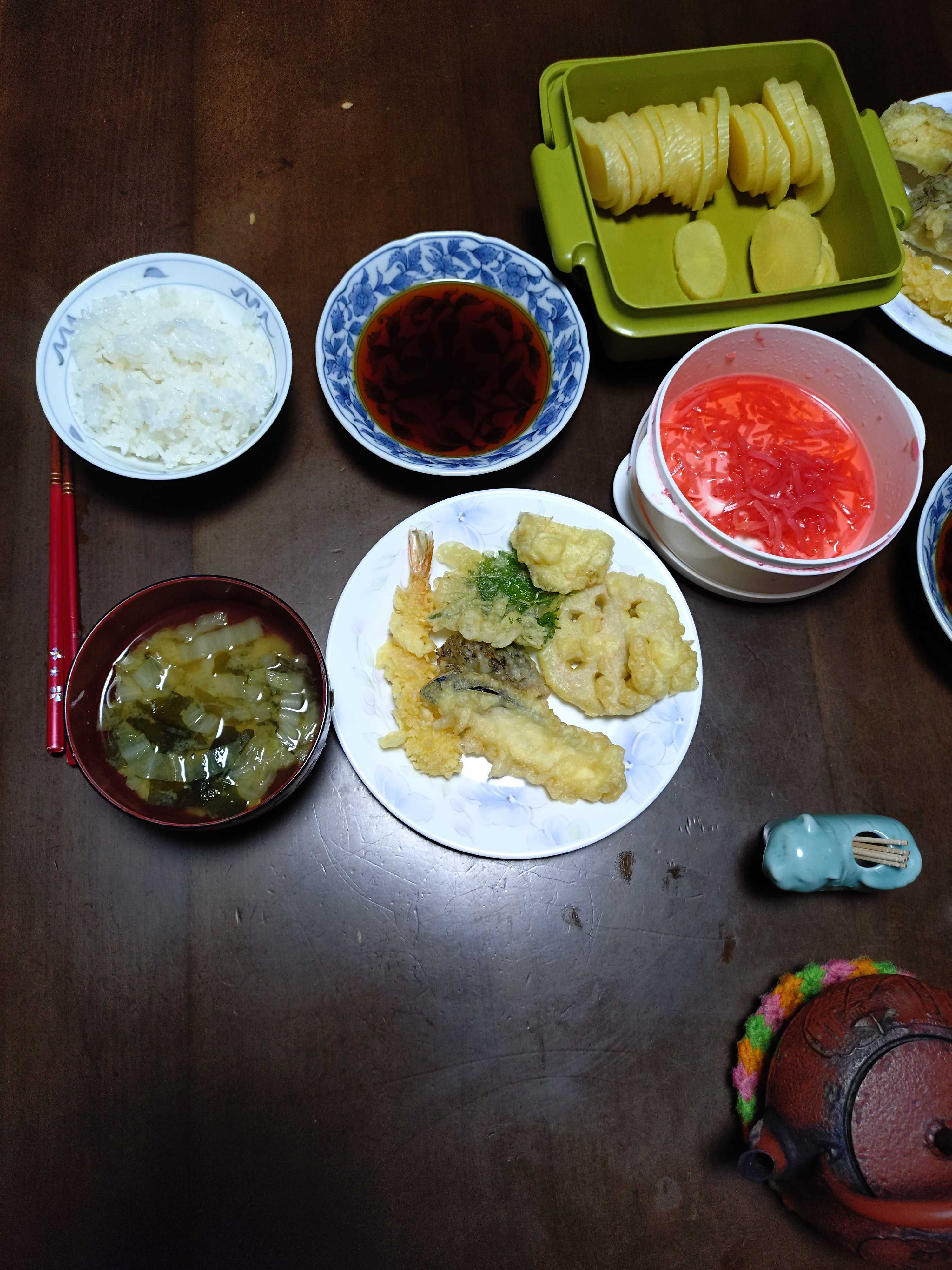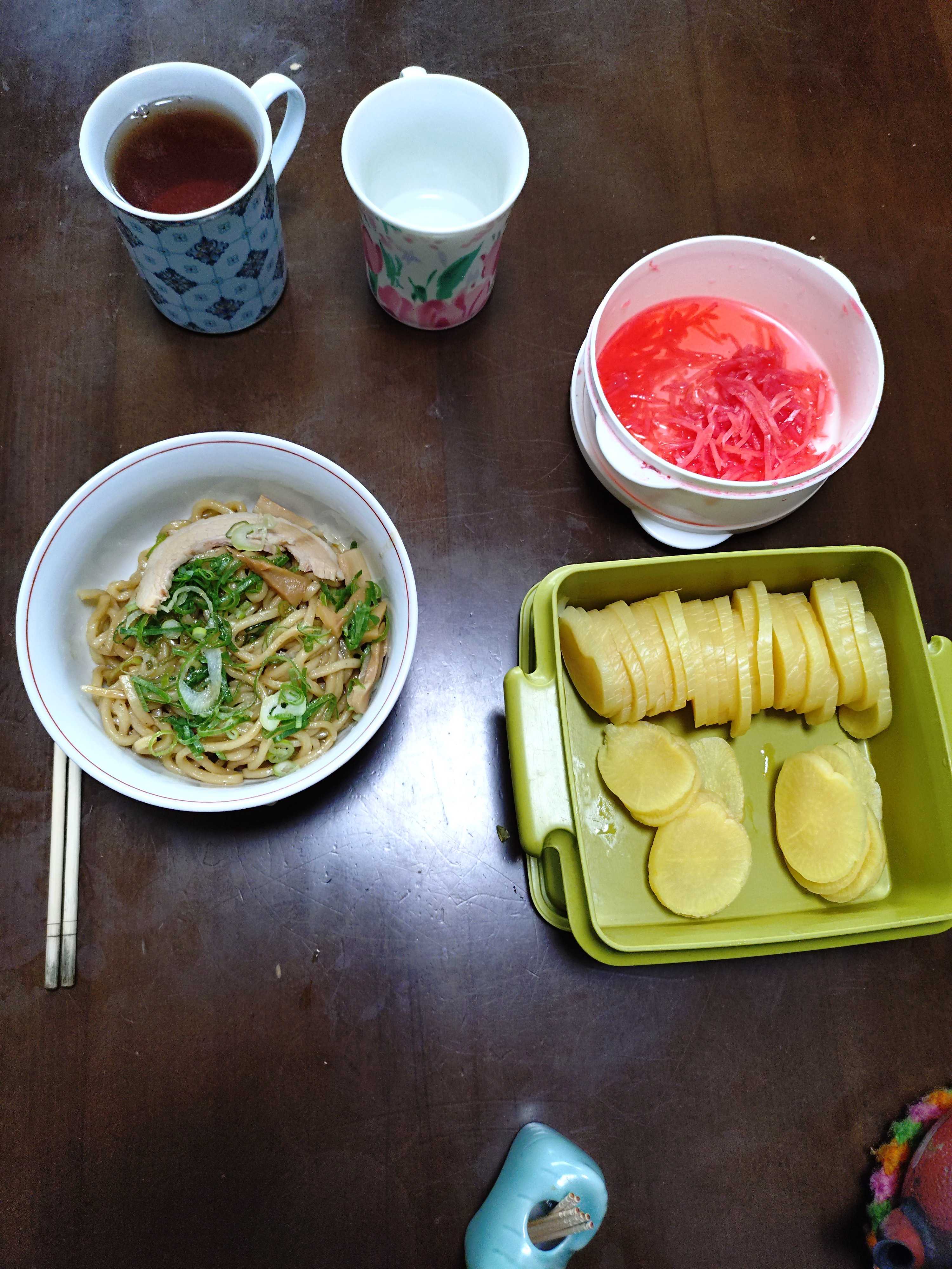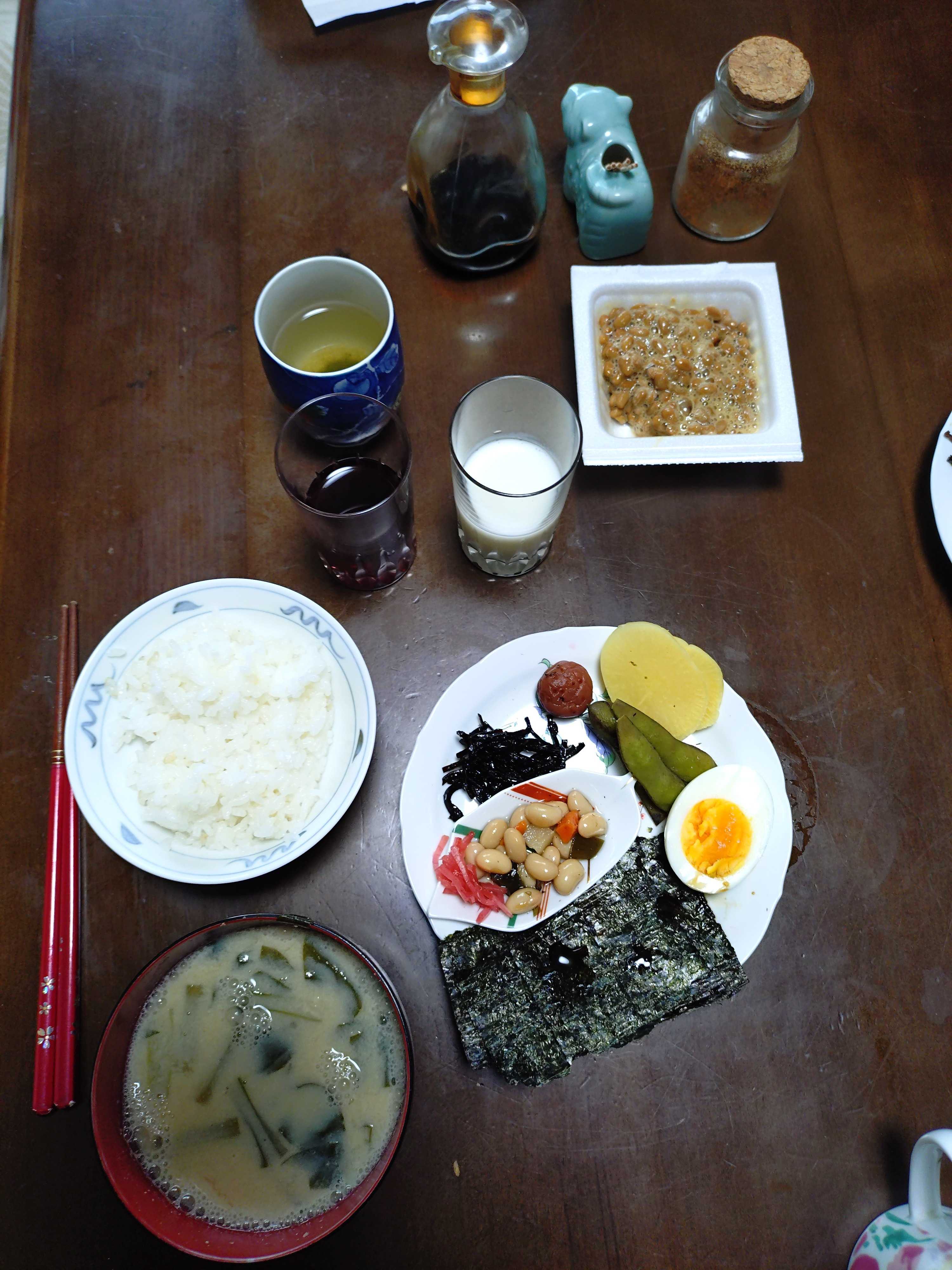 納豆 半分ずつ 沢庵 枝豆 茹で卵 焼きのり 煮豆 紅生姜 昆布つくだ煮 梅干し ヨーグルト ブドウジュース ご飯発芽玄米入り 味噌汁豆乳仕立て昼食 紅生姜 沢庵 汁無しラーメン インスタント夕食 沢庵 紅生姜 天ぷら各種 お惣菜 ご飯発芽玄米入り 味噌汁